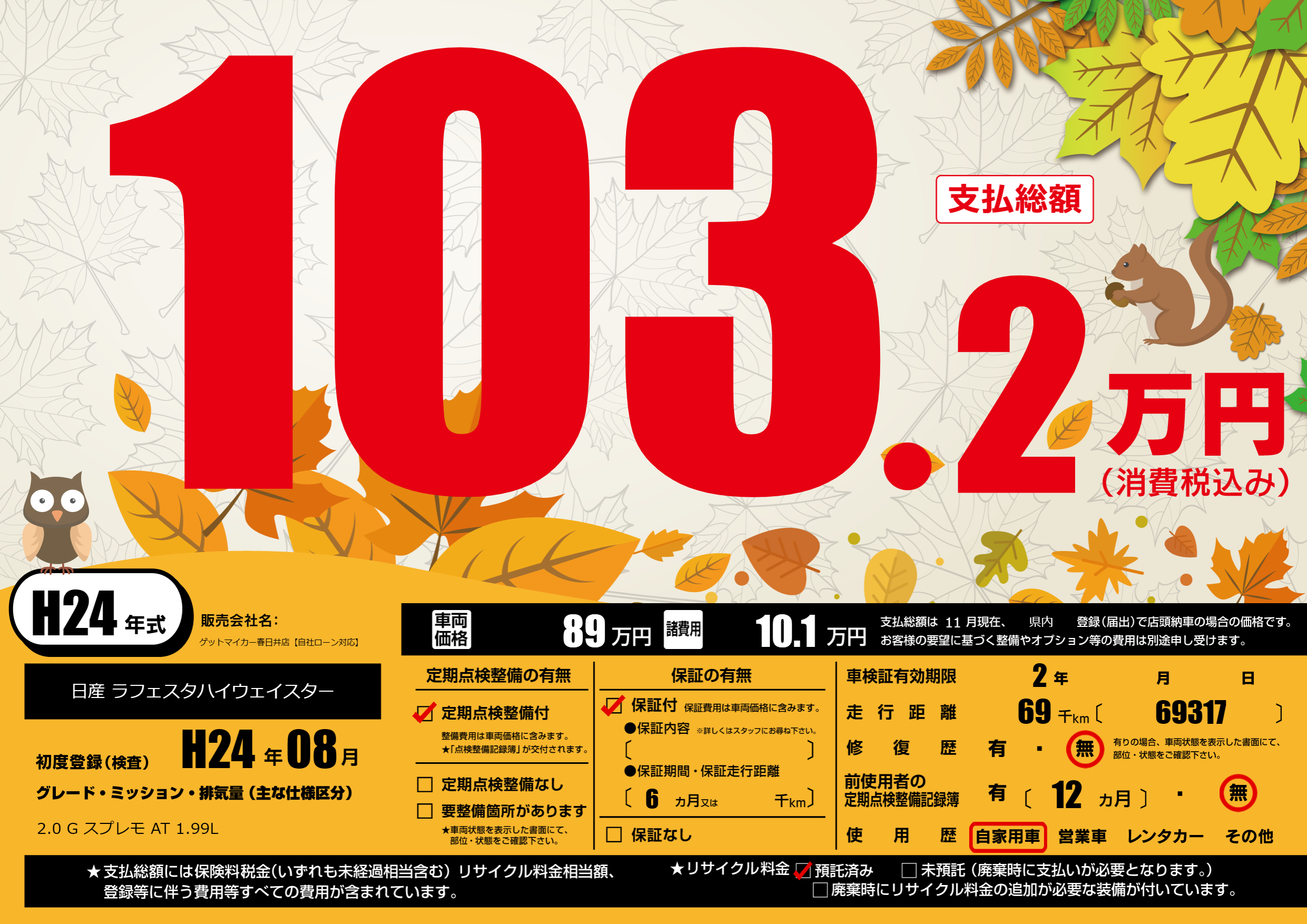 | 車名 | 日産 ラフェスタハイウェイスター | グレード ミッション 排気量 |