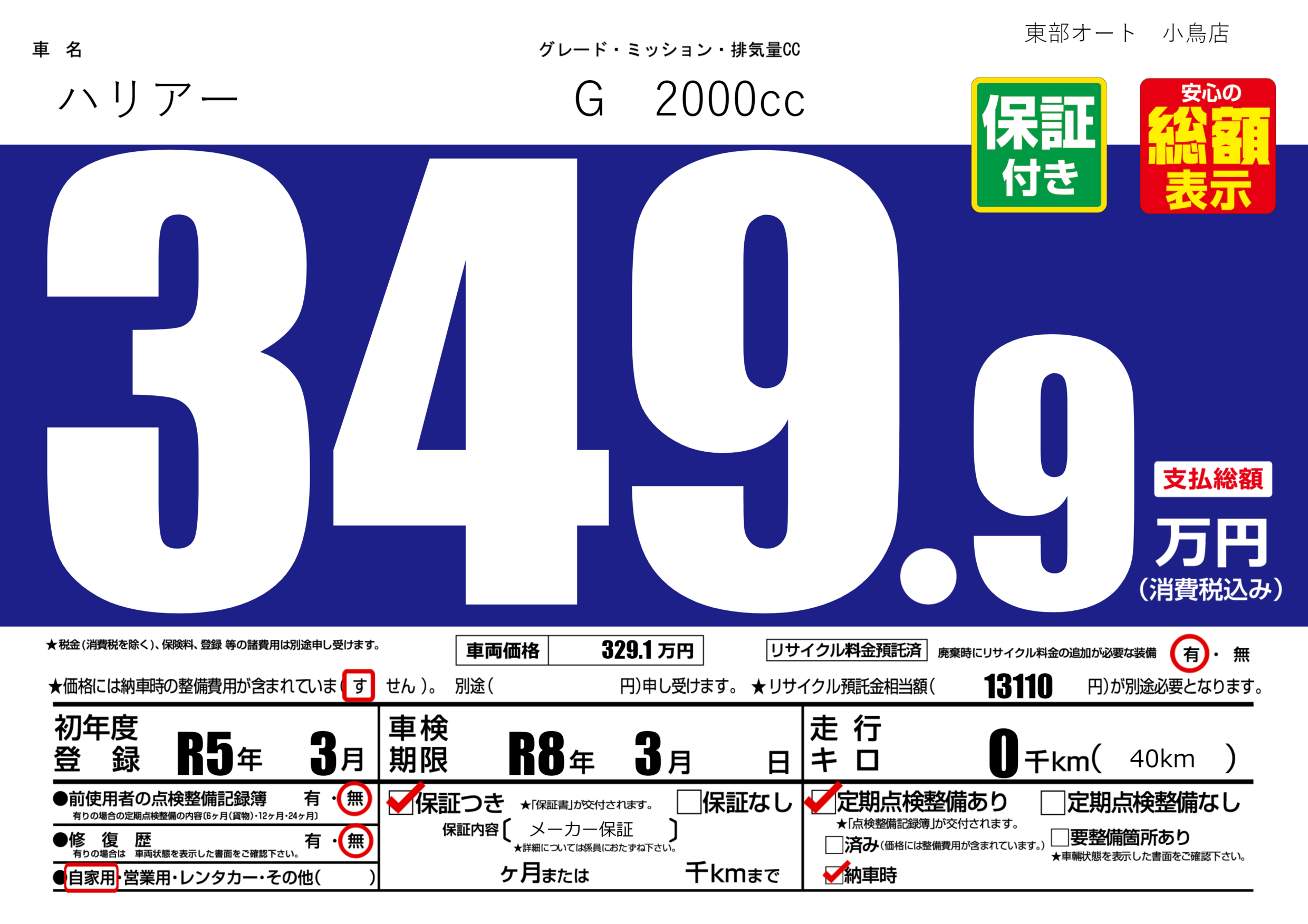 | 車検制限 | R8年 3月 - 日 | ||