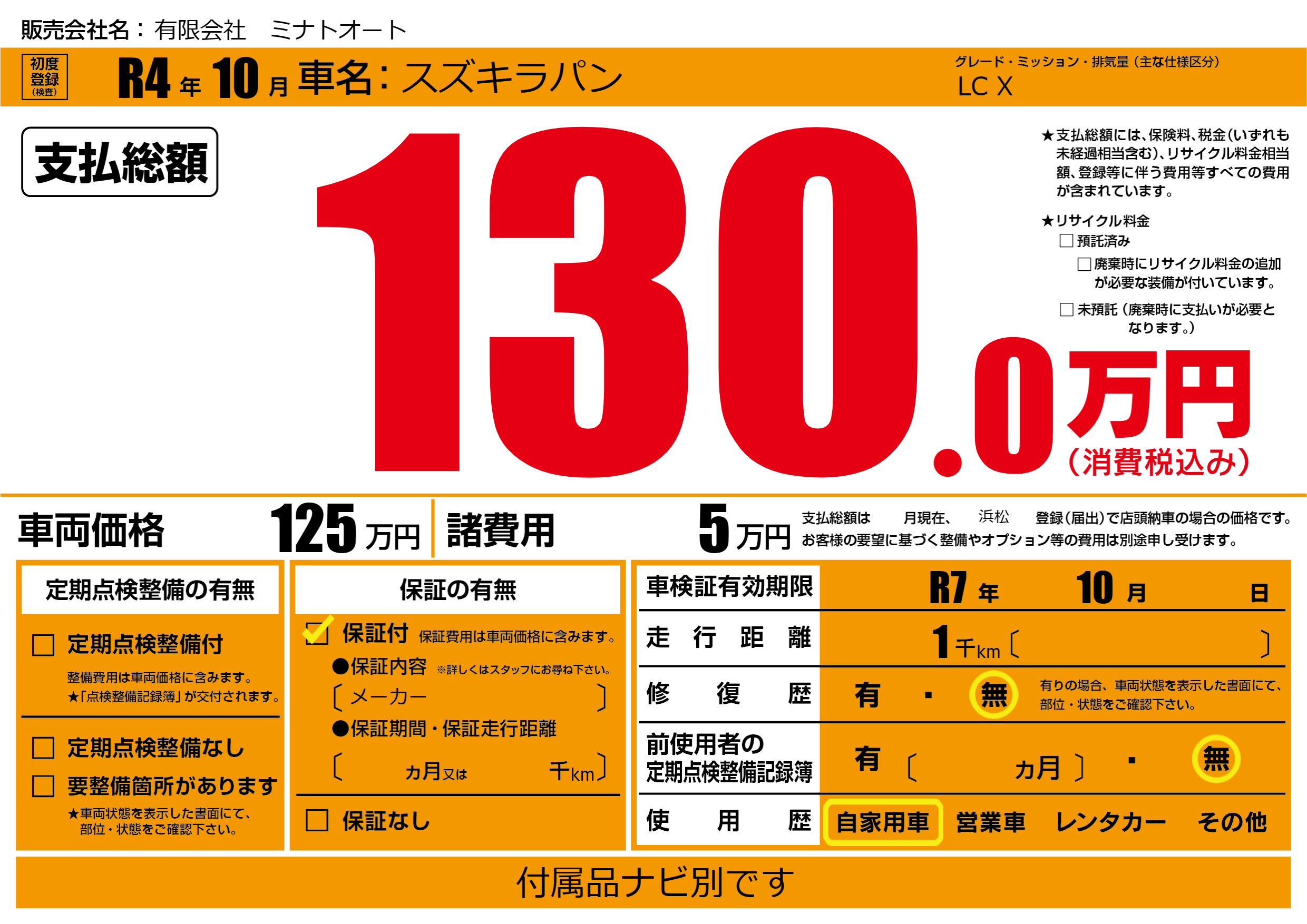 | 車名 | スズキラパン | グレード ミッション 排気量 |