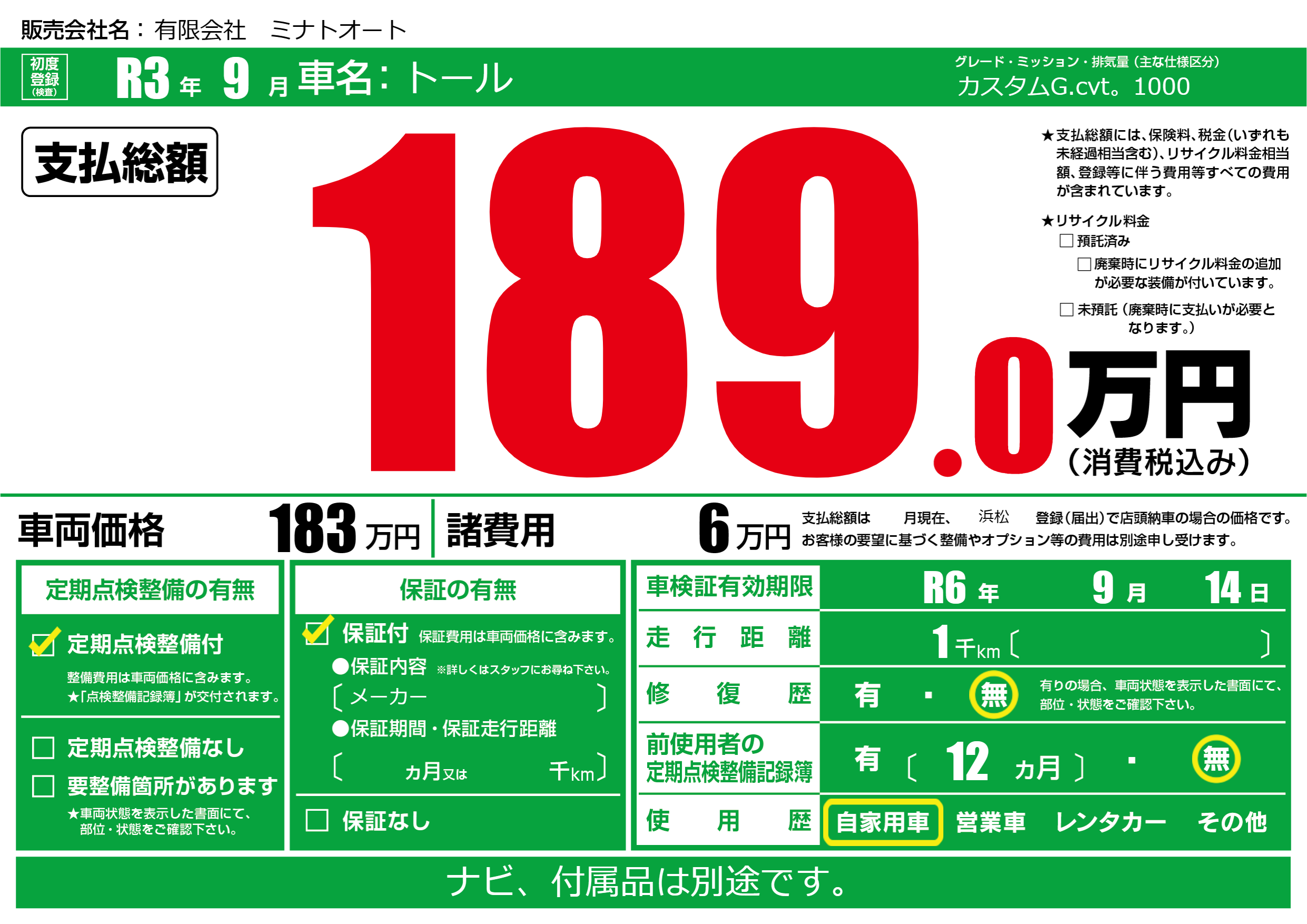 なし | 車検制限 | R6年9月14月 |