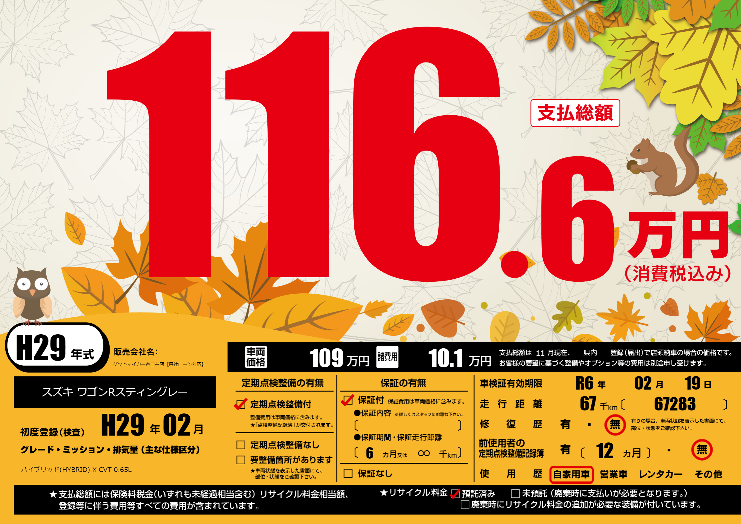 | 走行キロ | 6.7万km | 初年度登録 | H29年02月 |