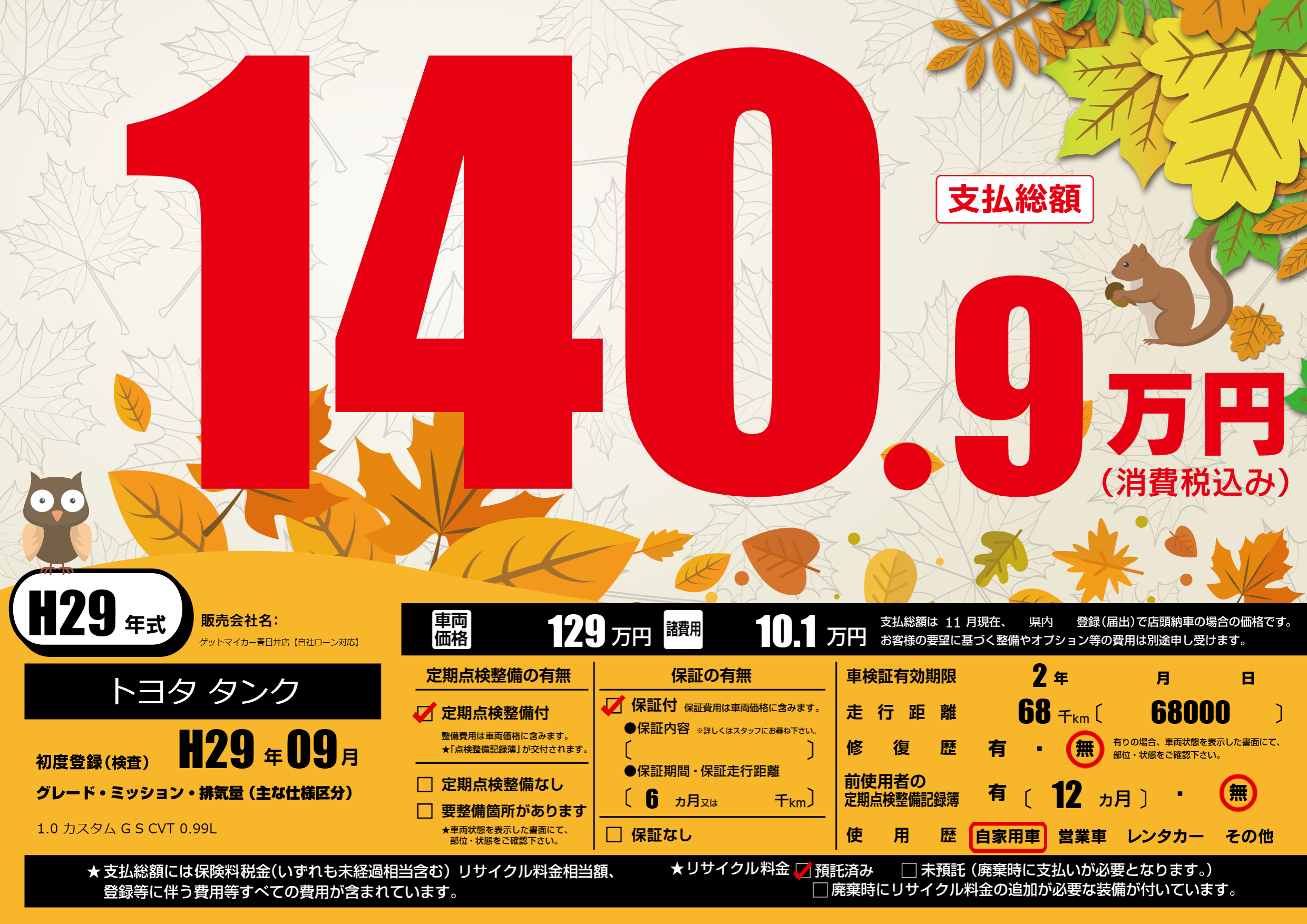| 走行キロ | 6.8万km | 初年度登録 | H29年09月 |