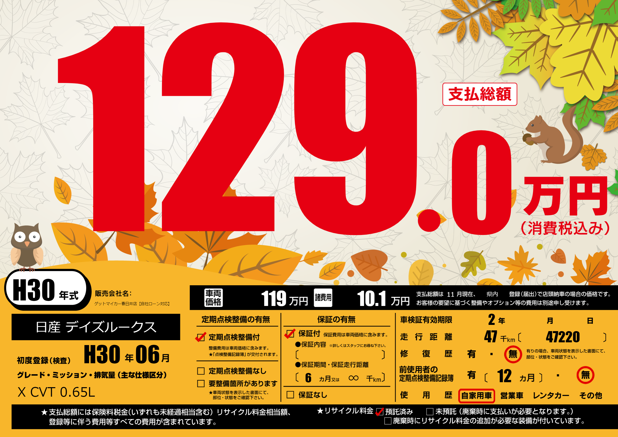 | 走行キロ | 4.7万km | 初年度登録 | H30年06月 |