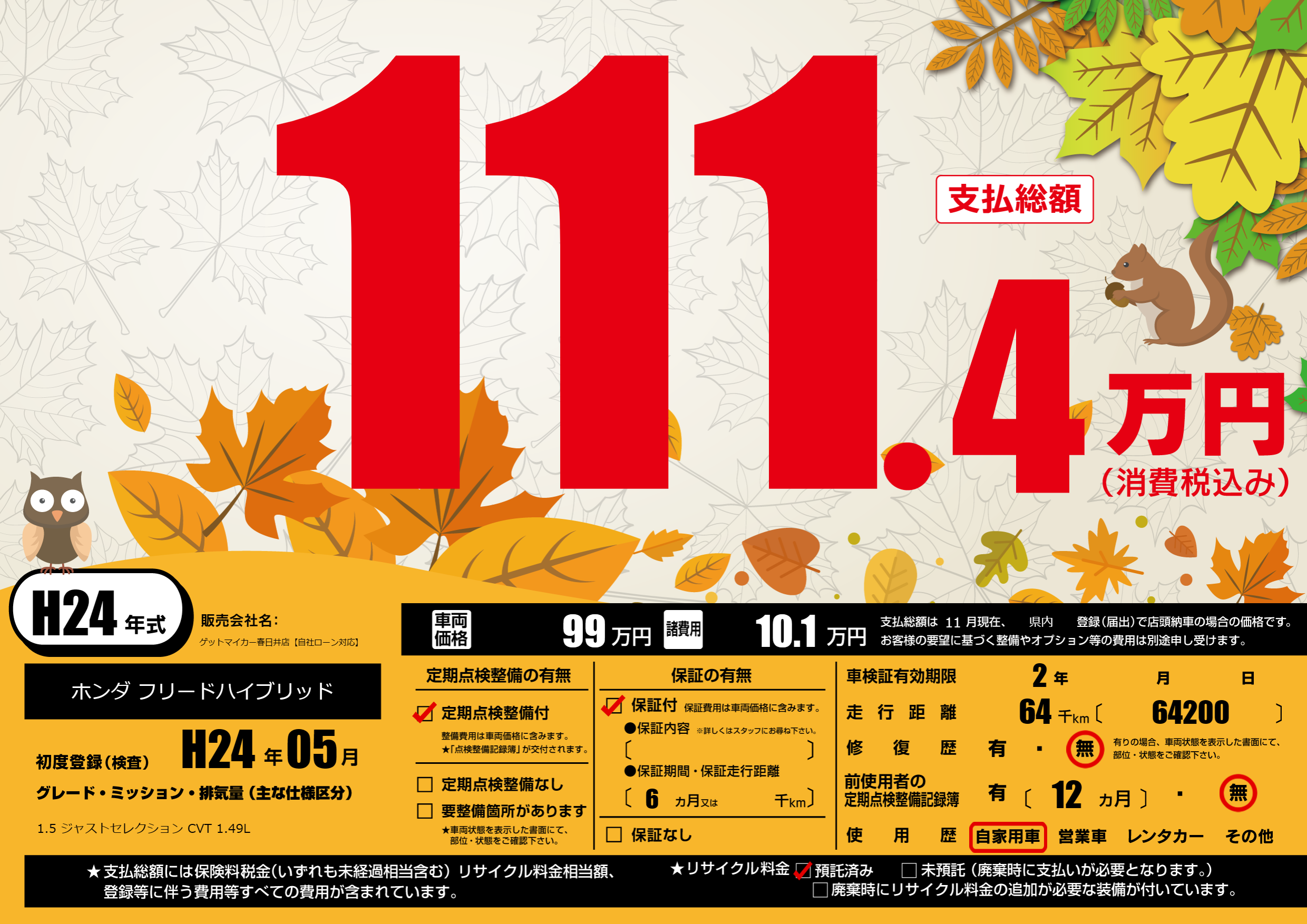 | 車名 | ホンダ フリードハイブリッド | グレード ミッション 排気量 |
