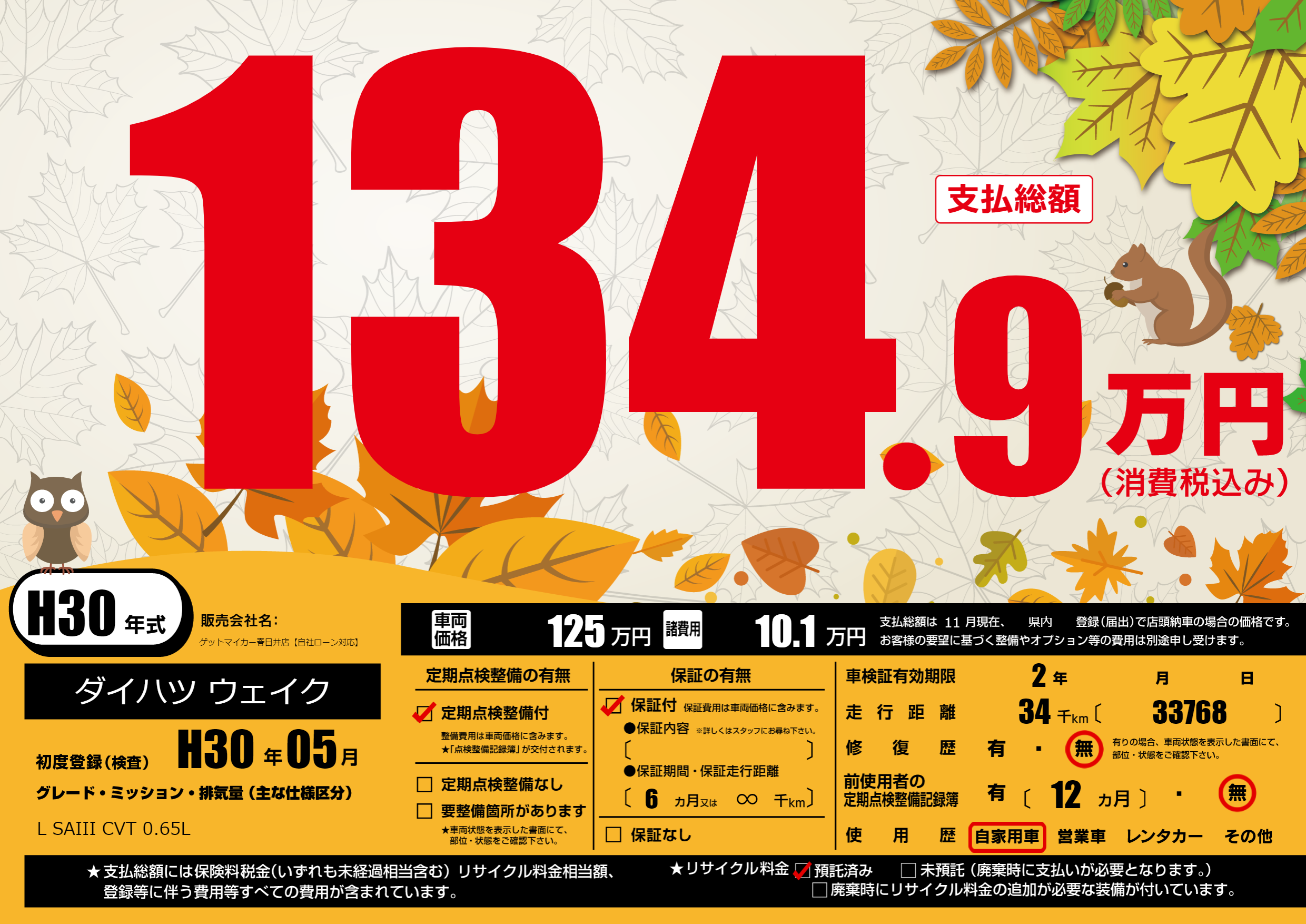 | 車名 | ダイハツ ウェイク | グレード ミッション 排気量 |