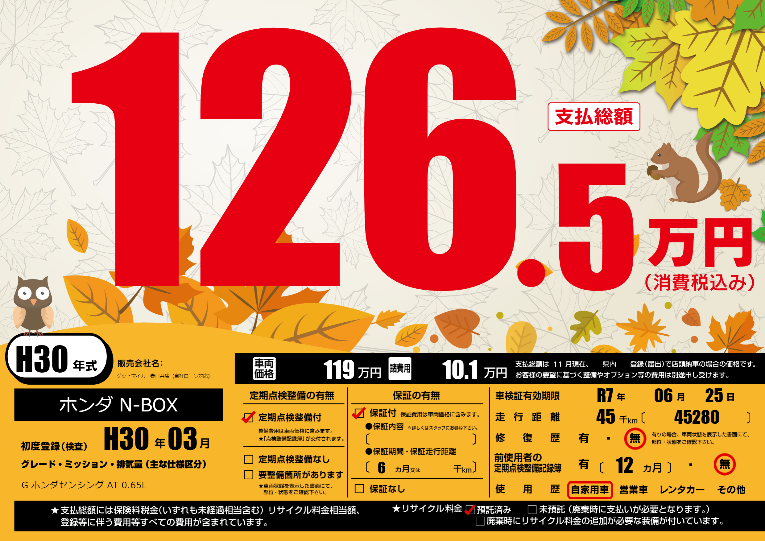 | 走行キロ | 4.5万km | 初年度登録 | H30年03月 |