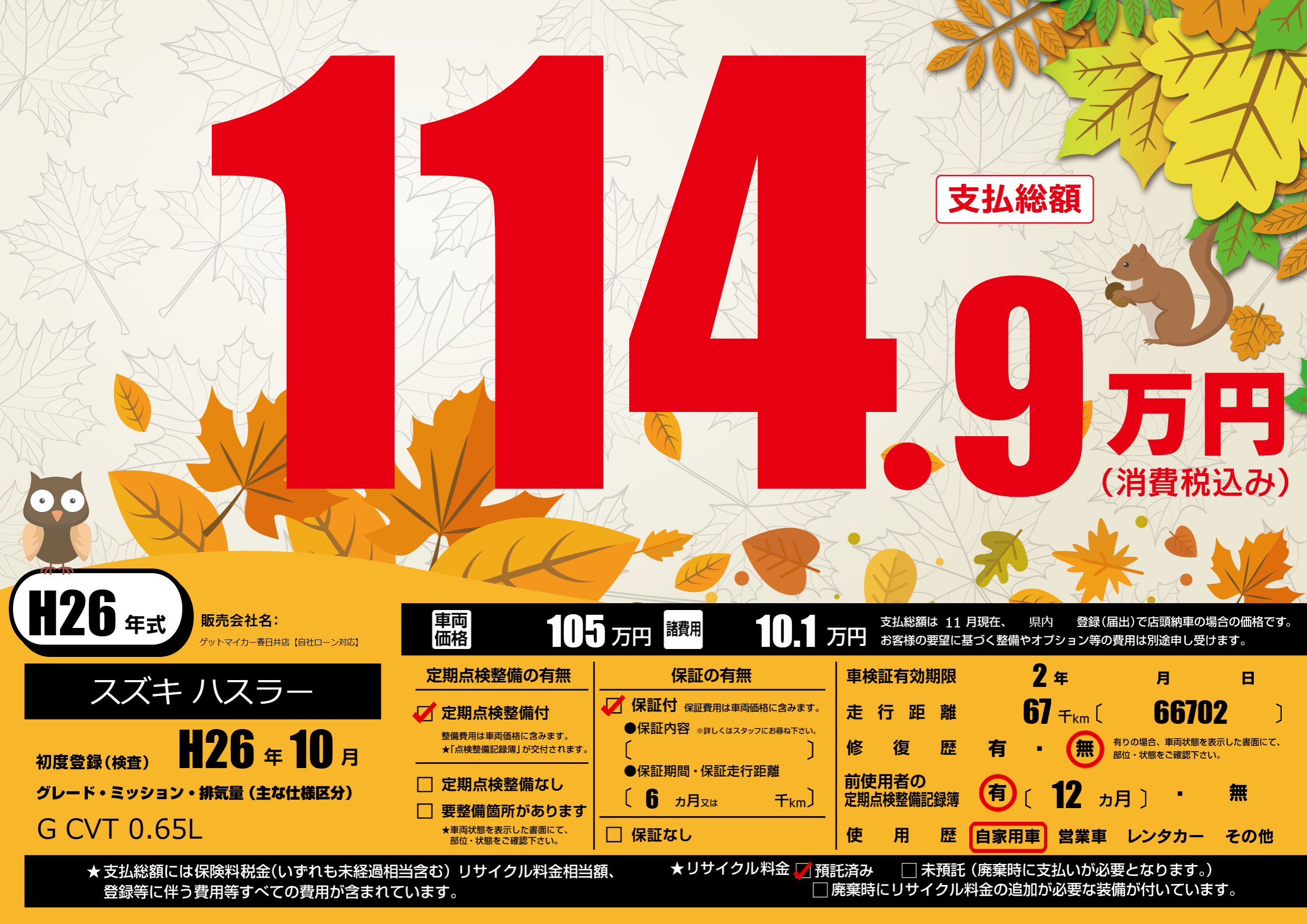 | 車名 | スズキ ハスラー | グレード ミッション 排気量 |