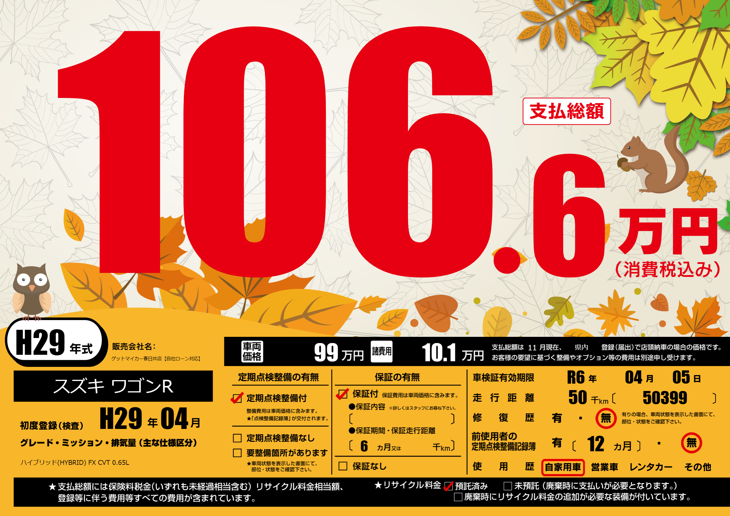 | 走行キロ | 5万km | 初年度登録 | H29年04月 |