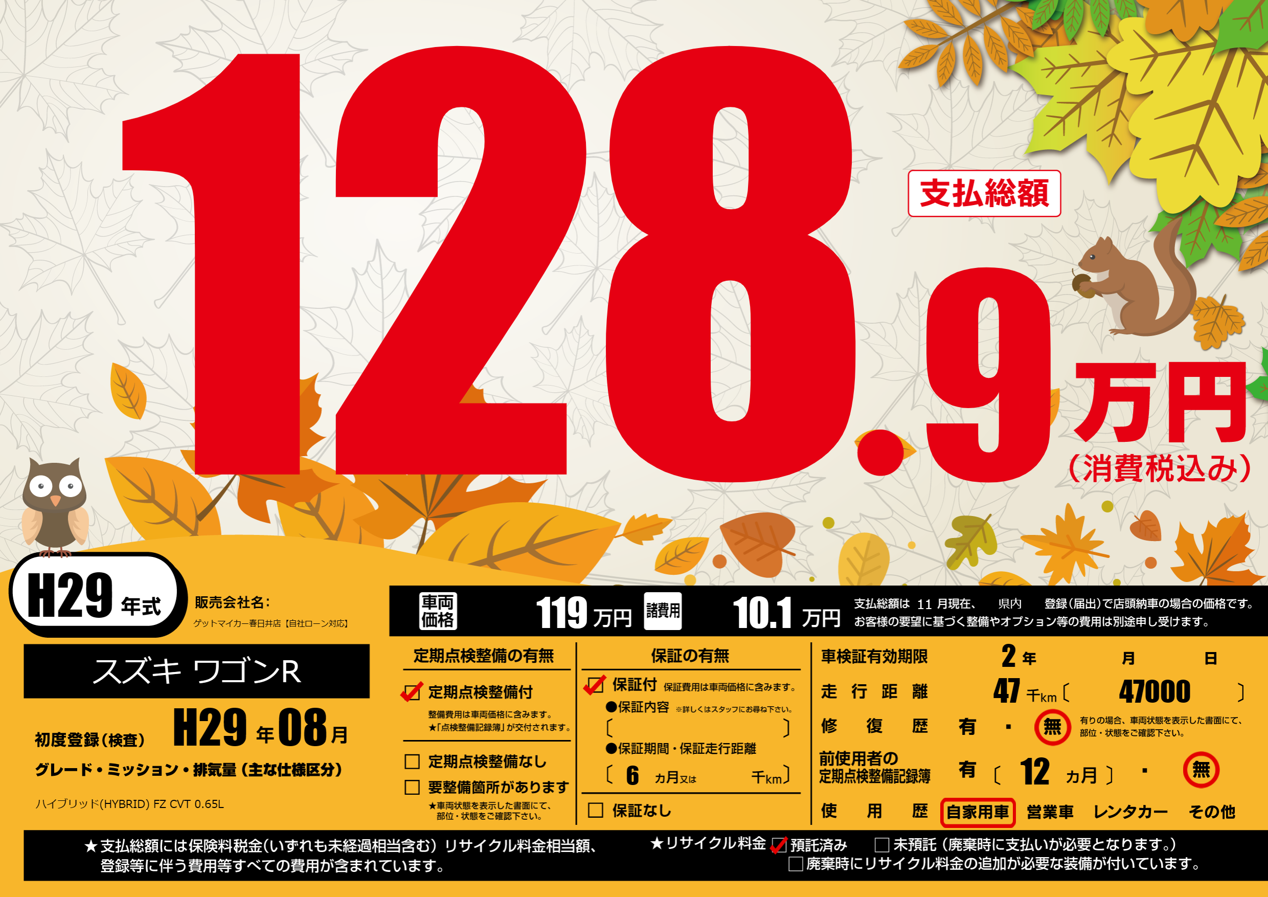 | 走行キロ | 4.7万km | 初年度登録 | H29年08月 |
