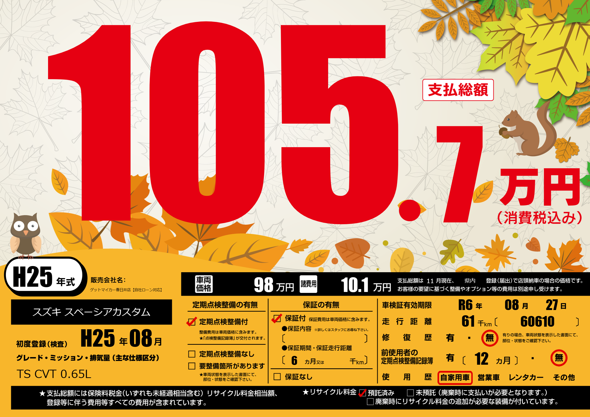 | 走行キロ | 6.1万km | 初年度登録 | H25年08月 |
