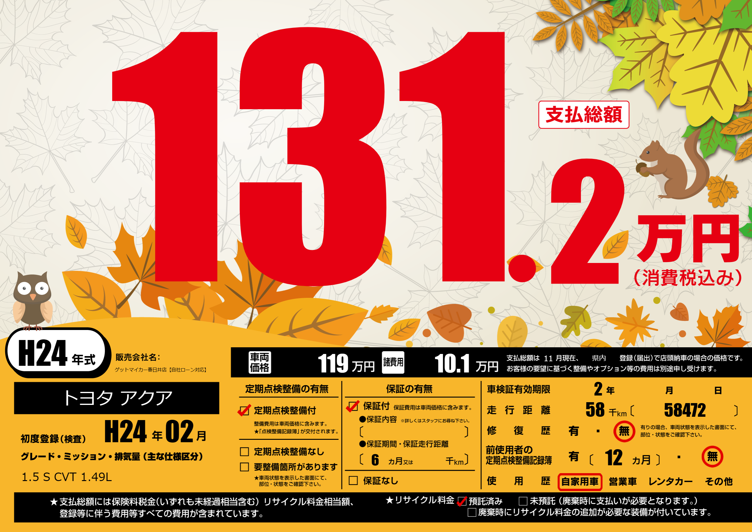 | 車名 | トヨタ アクア | グレード ミッション 排気量 |
