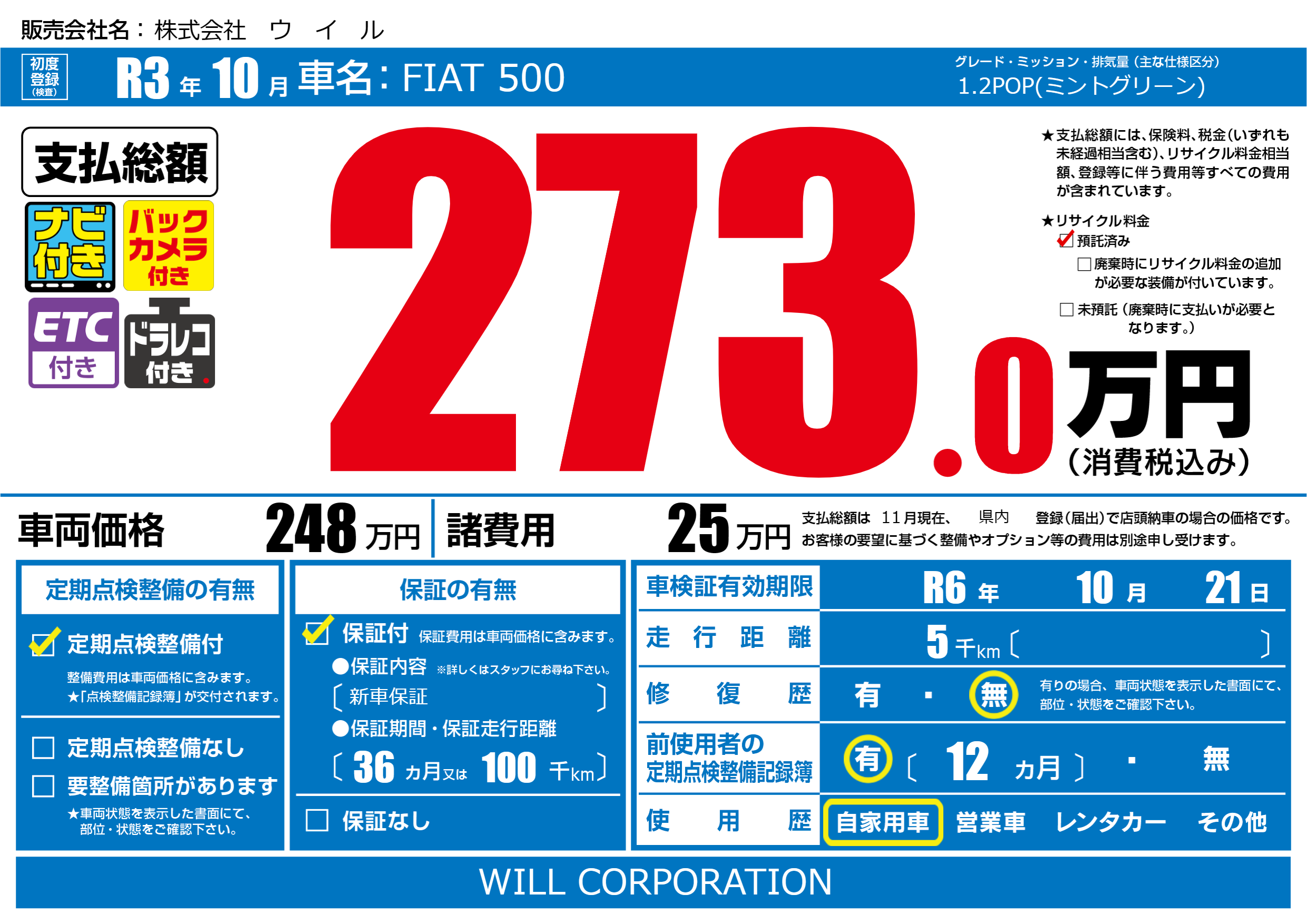 | 車名 | FIAT 500 | グレード ミッション 排気量 |