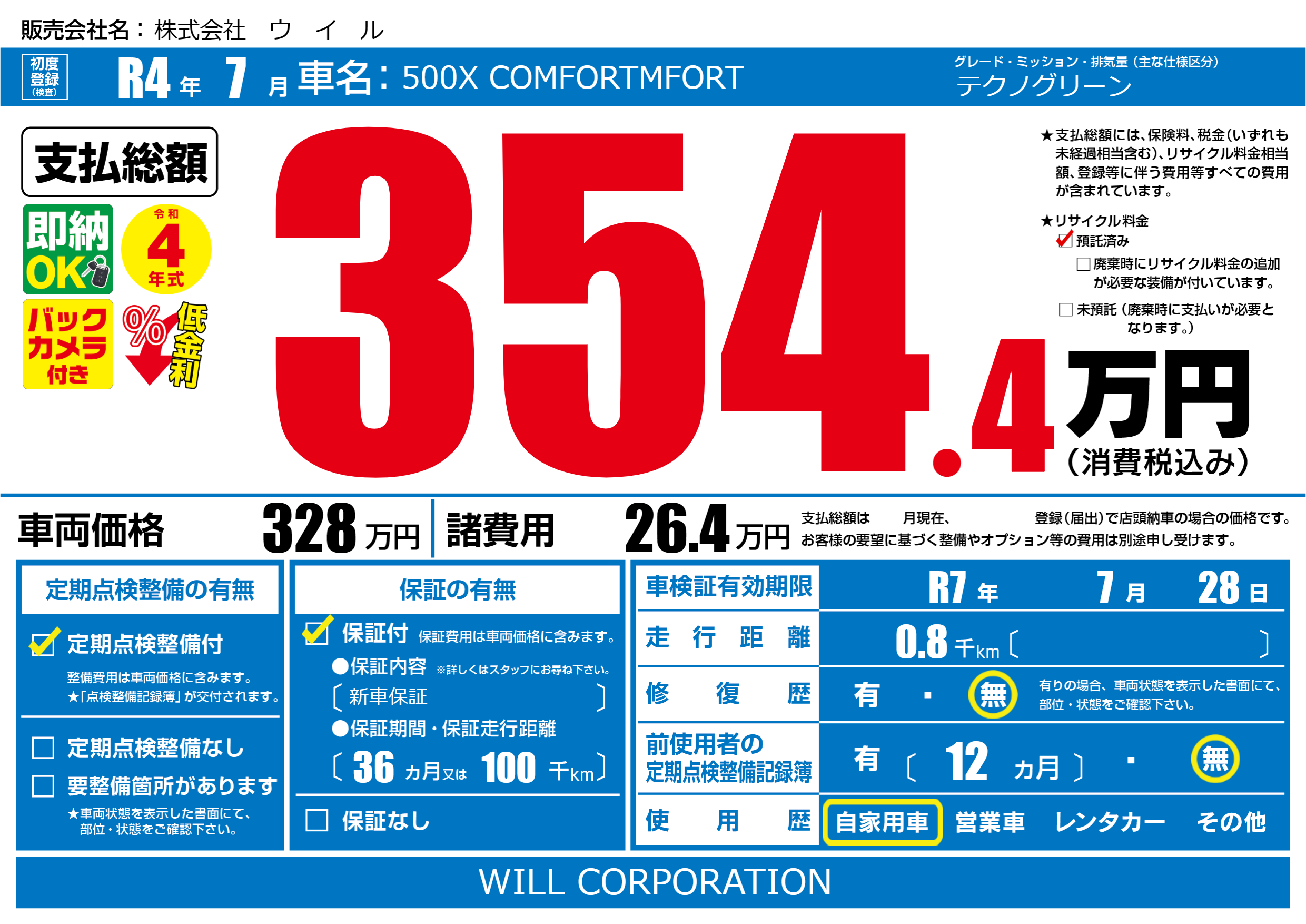 | 車名 | 500X COMFORTMFORT | グレード ミッション 排気量 |