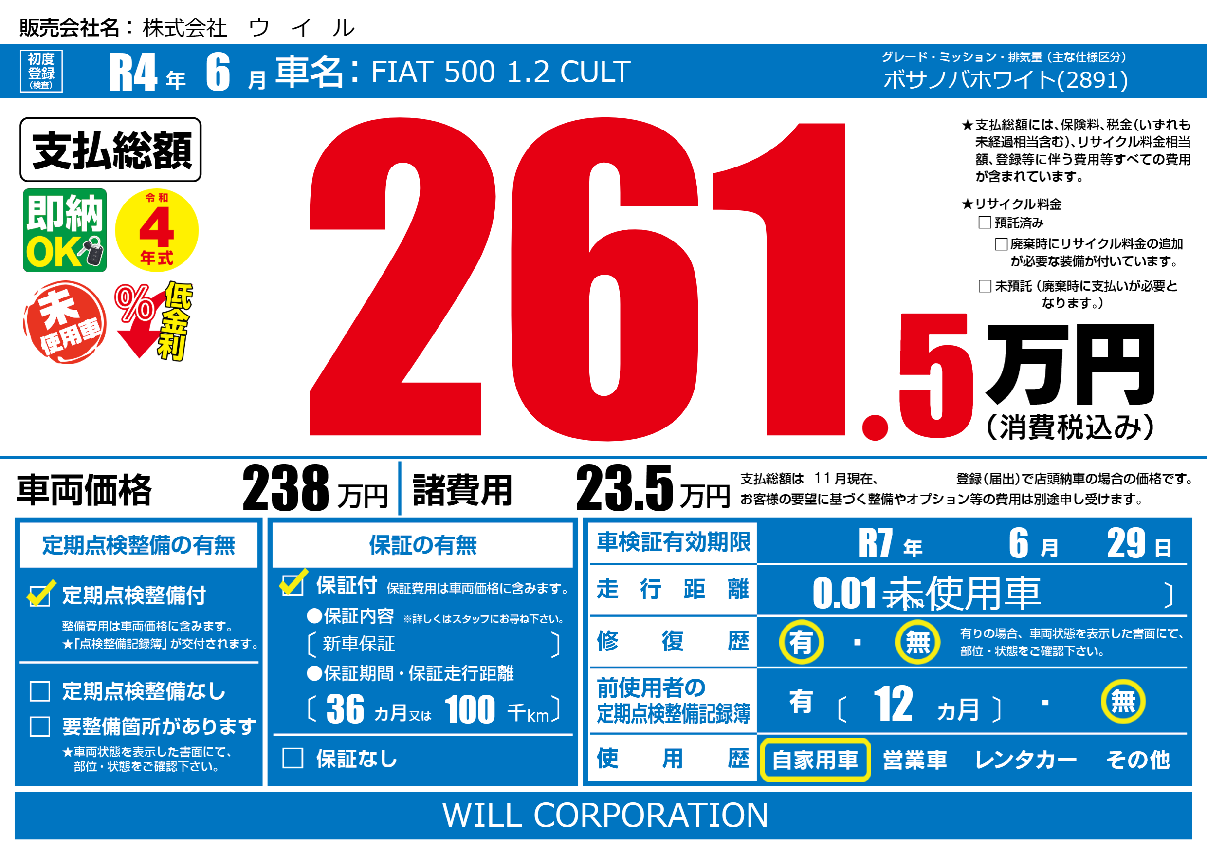| 車名 | FIAT 500 1.2 CULT | グレード ミッション 排気量 |
