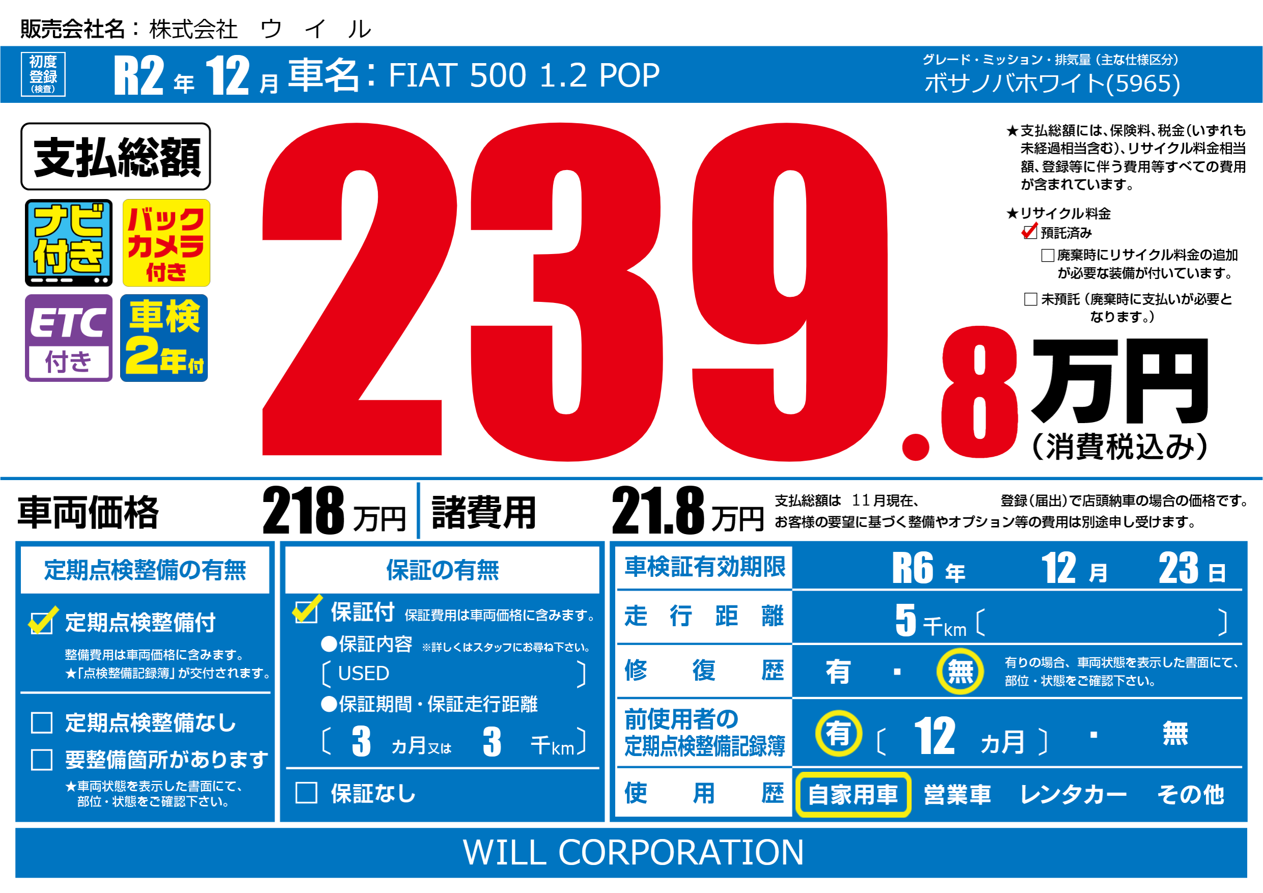 | 車検制限 | R6年 12月 23日 | ||