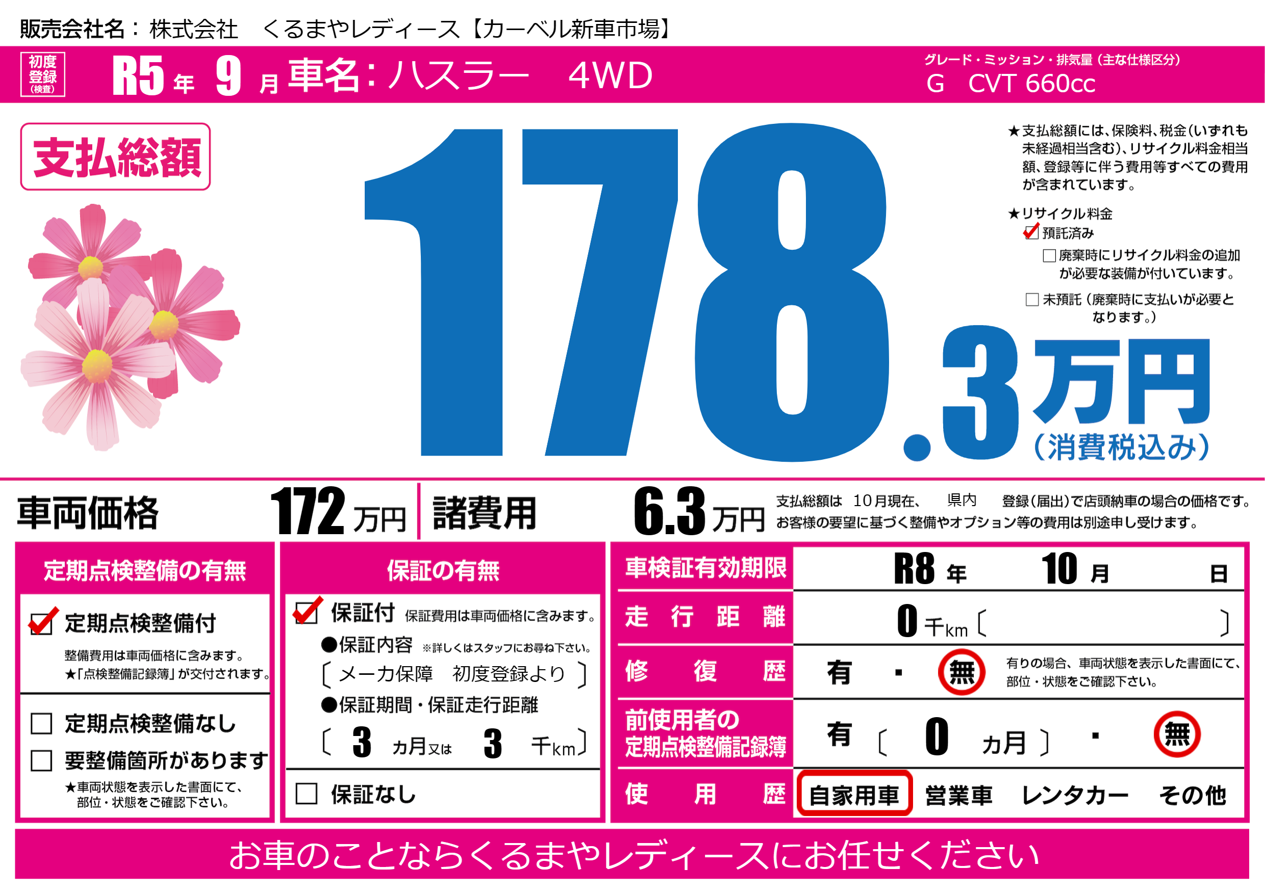| 車名 | ハスラー 4WD | グレード ミッション 排気量 |