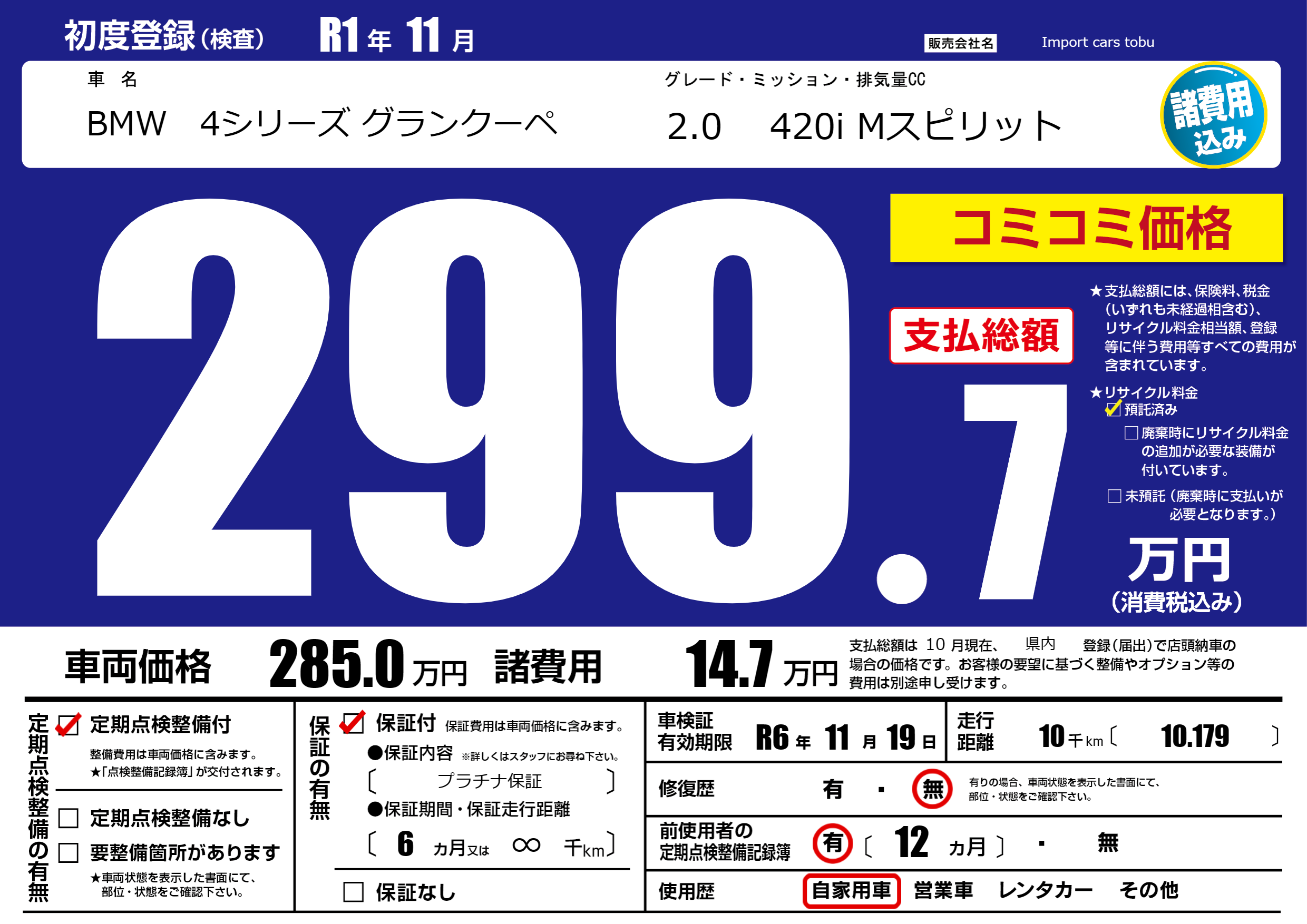 保証付き 保証内容( プラチナ保証) 6ヶ月または(∞)千kmまで |