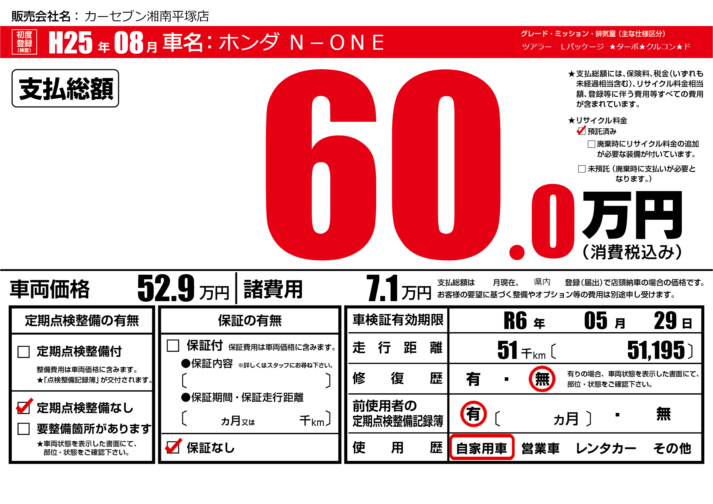 | 車名 | ホンダ N-ONE | グレード ミッション 排気量 |