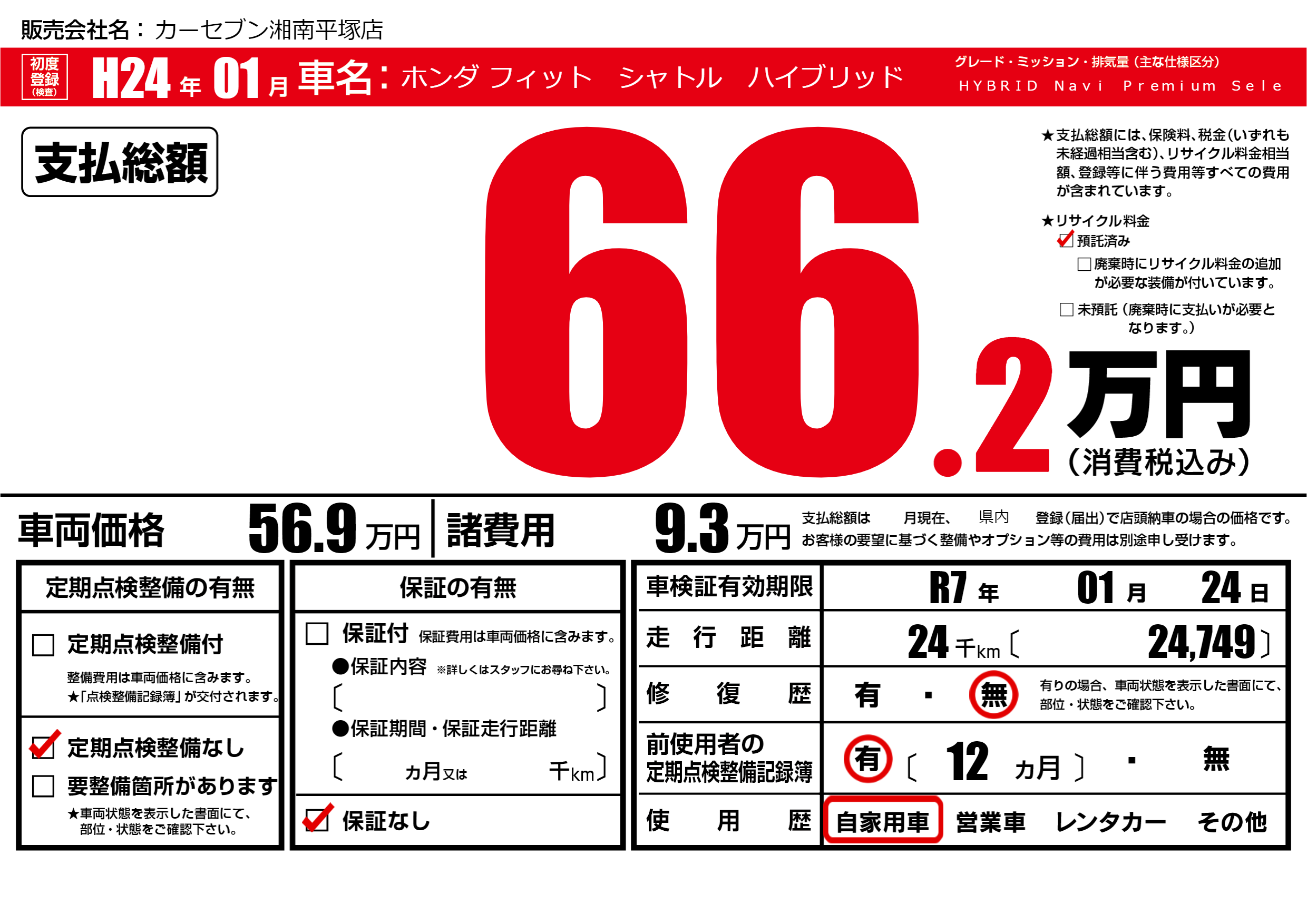 | 走行キロ | 2.4万km | 初年度登録 | H24年01月 |