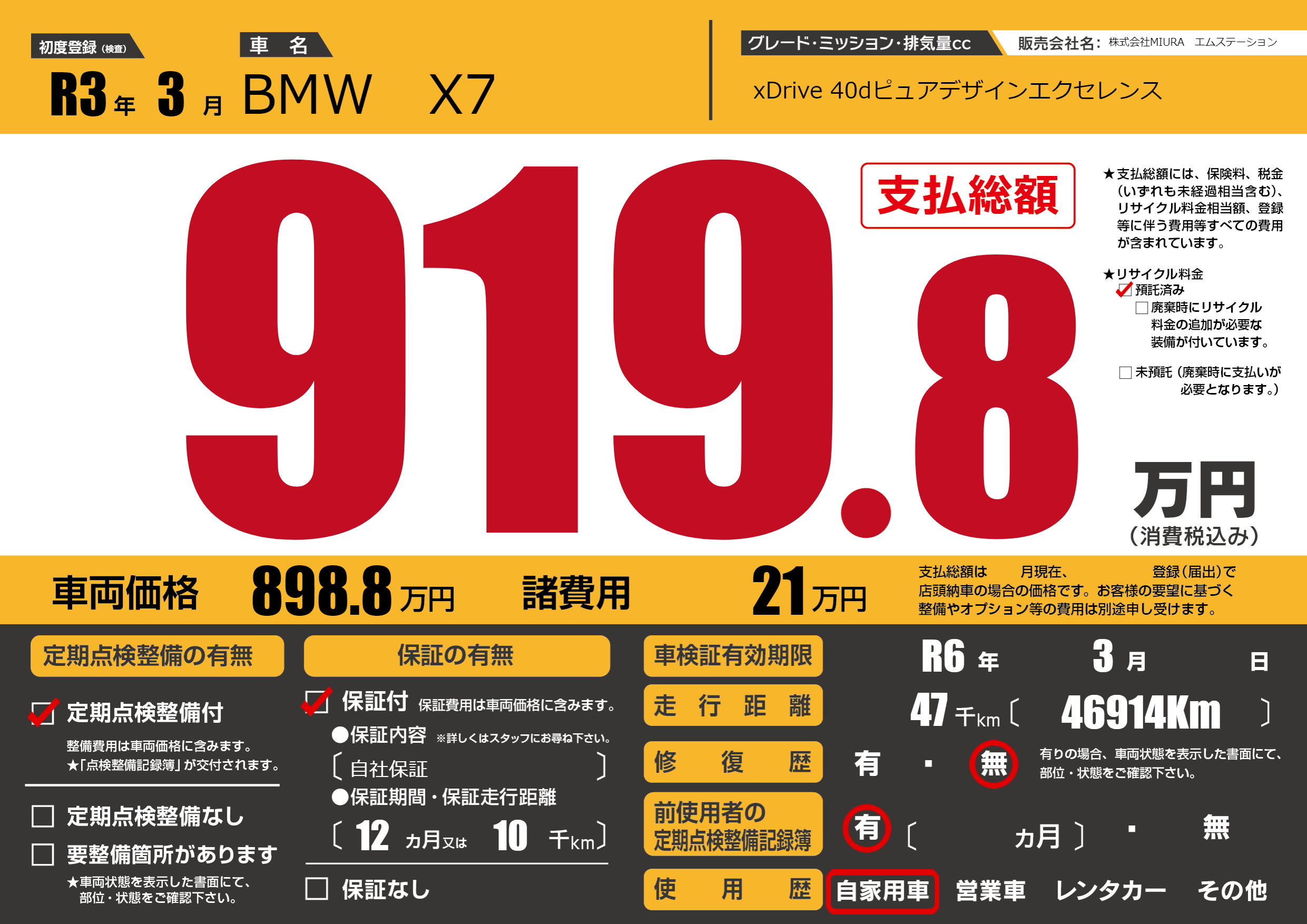 | 車名 | BMW X7 | グレード ミッション 排気量 |