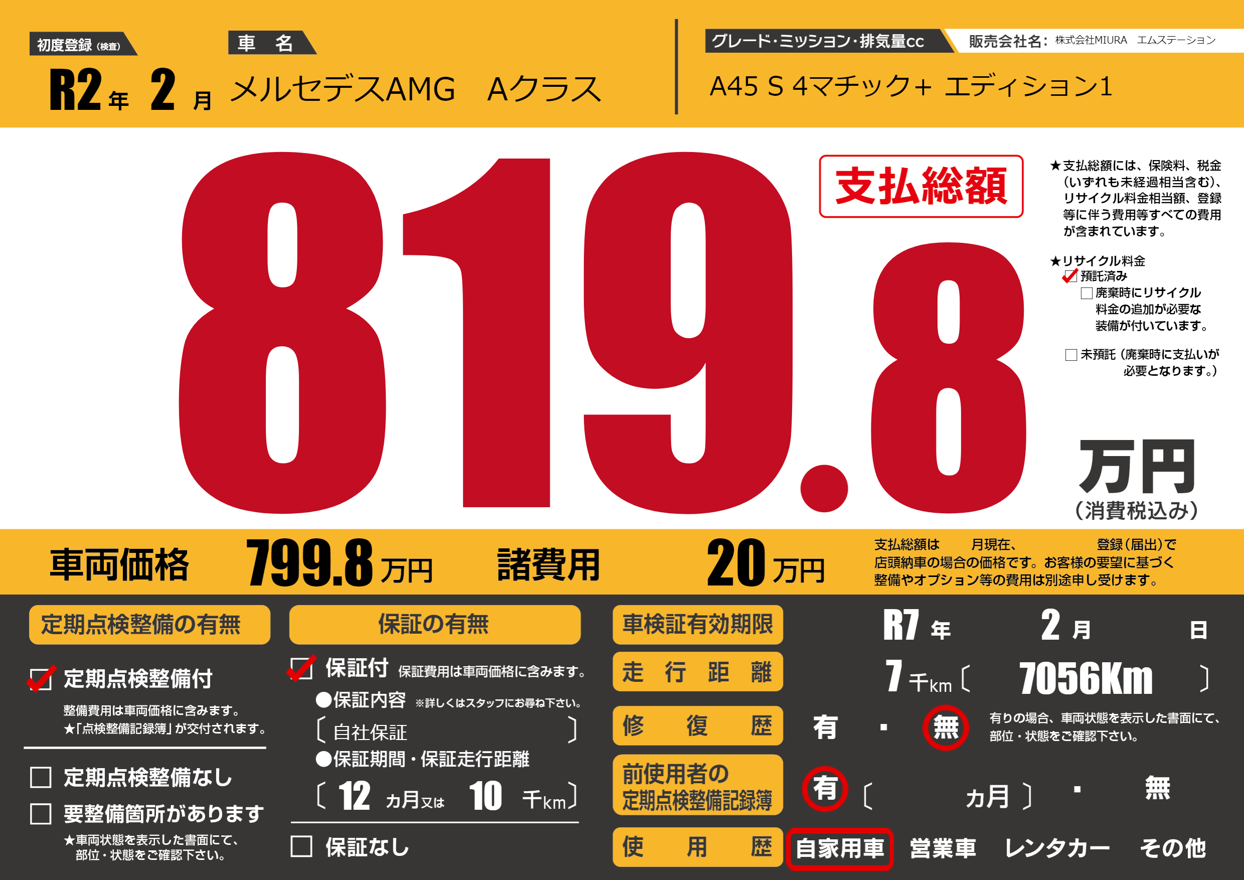 | 車名 | メルセデスAMG Aクラス | グレード ミッション 排気量 |
