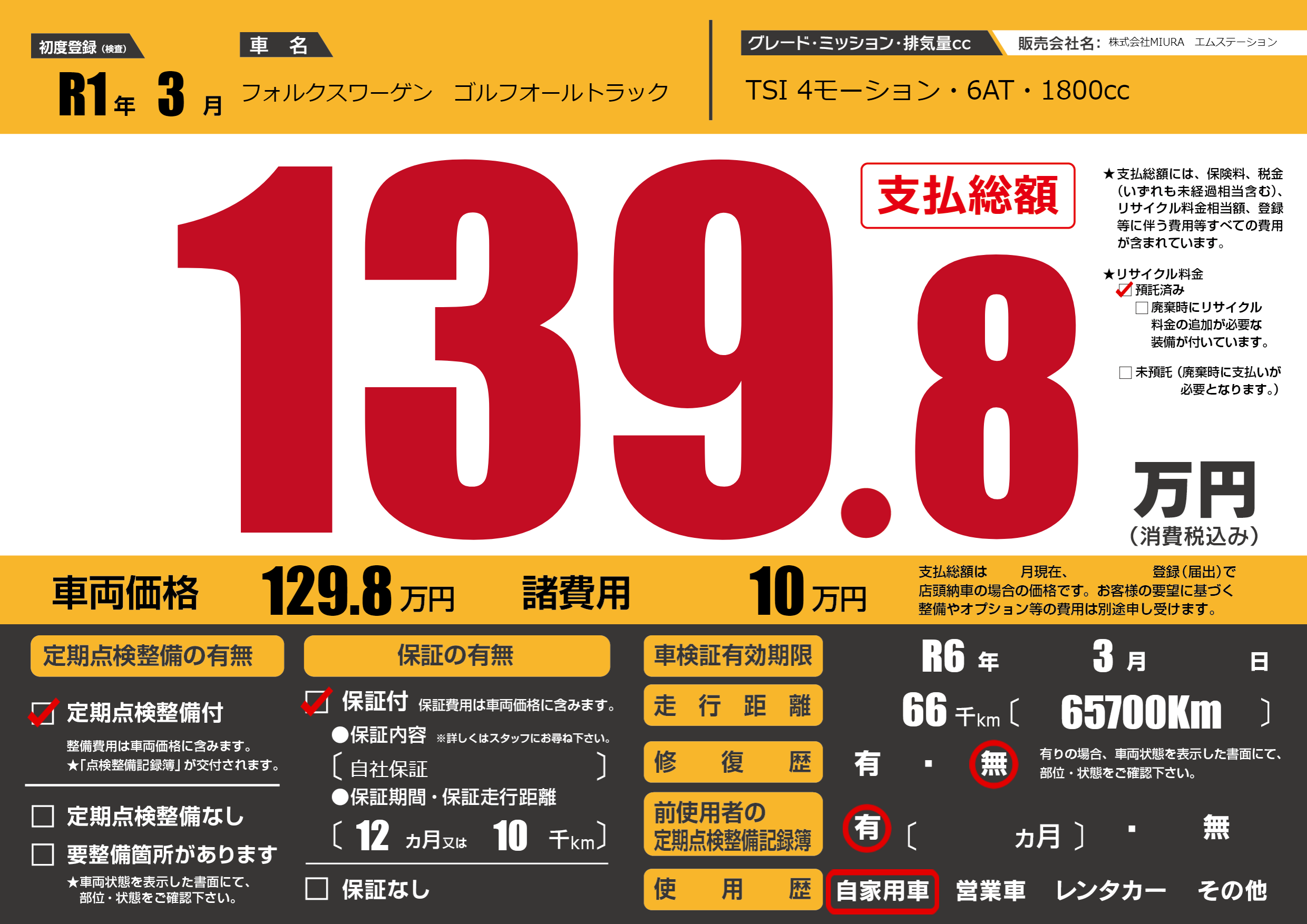 | 走行キロ | 6.6万km | 初年度登録 | R1年3月 |