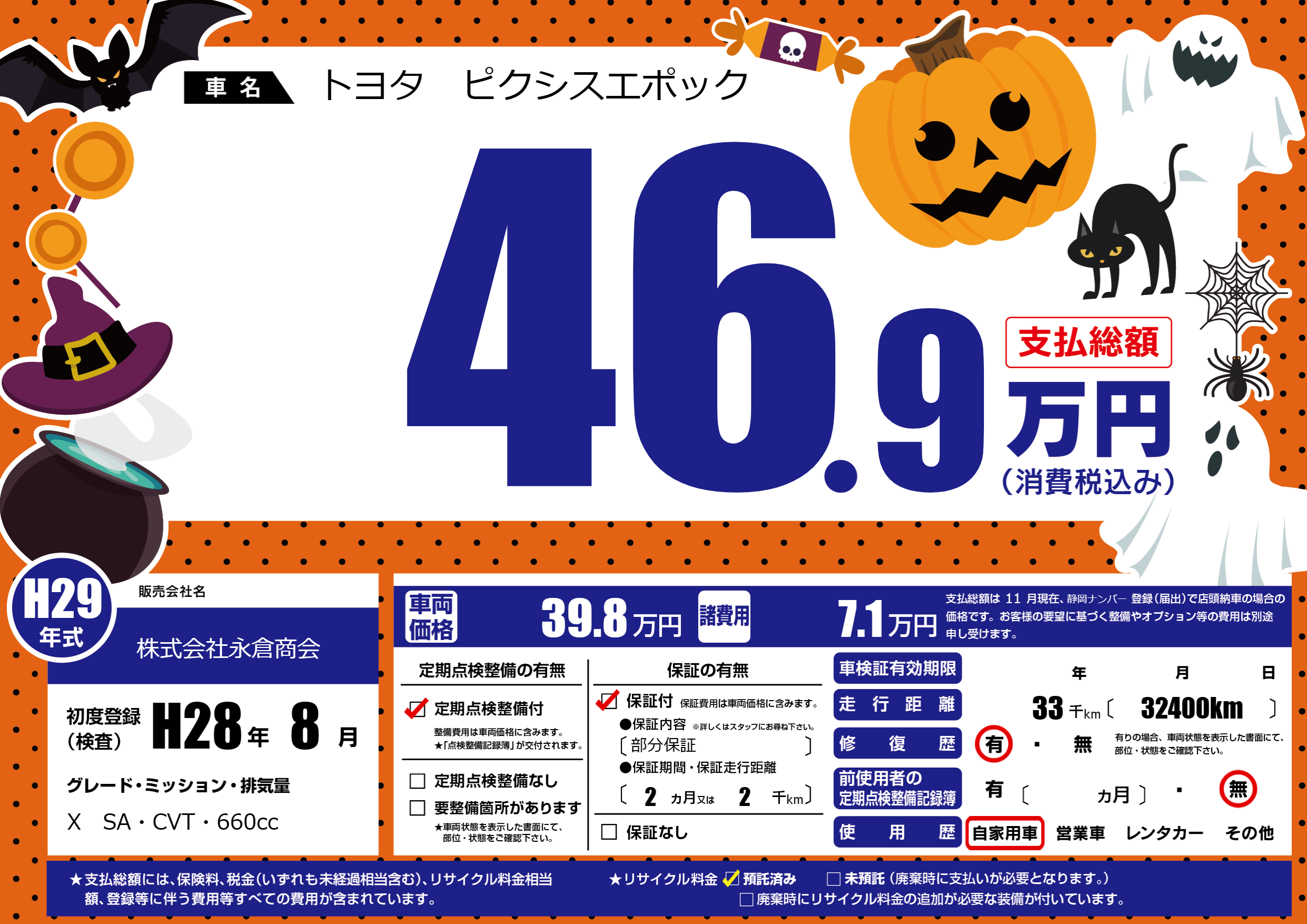 | 走行キロ | 3.3万km | 初年度登録 | H28年8月 |