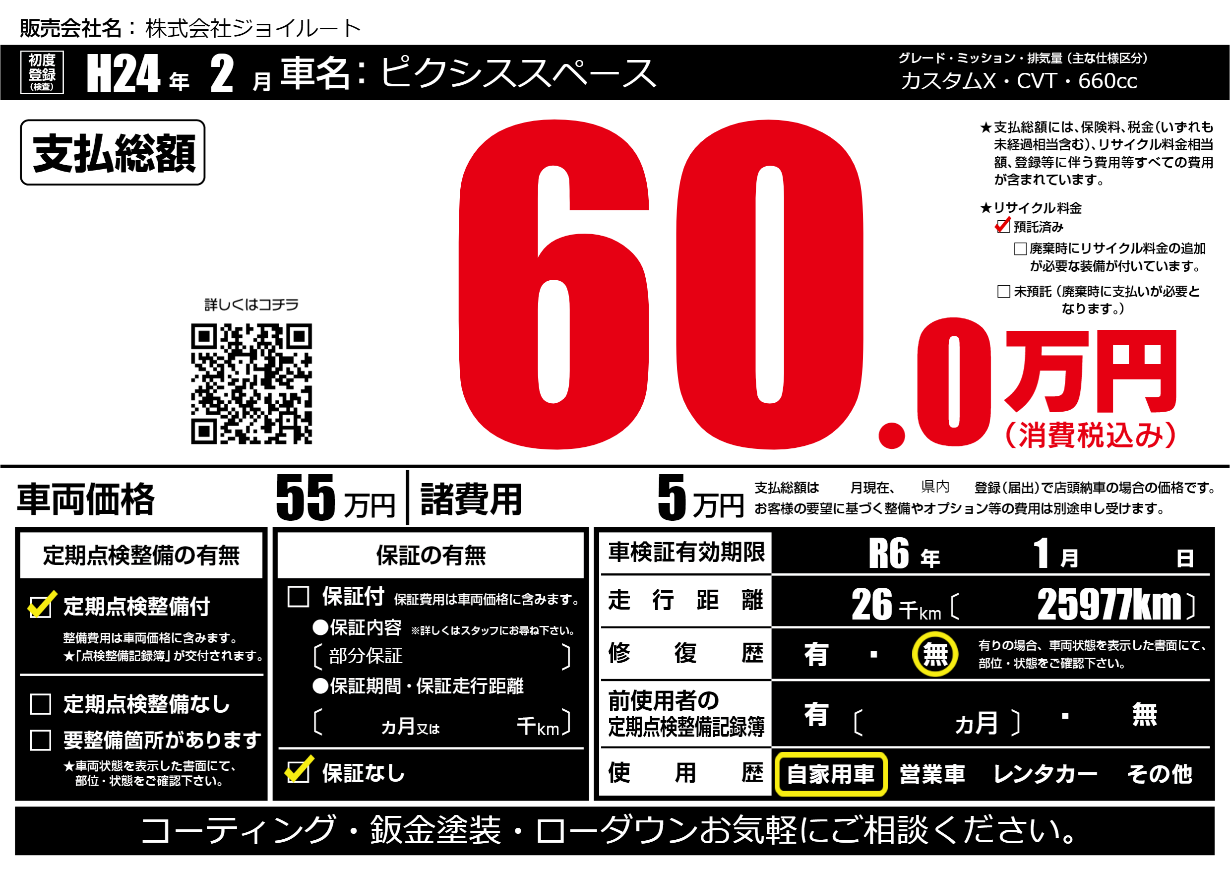 | 走行キロ | 2.6万km | 初年度登録 | H24年2月 |