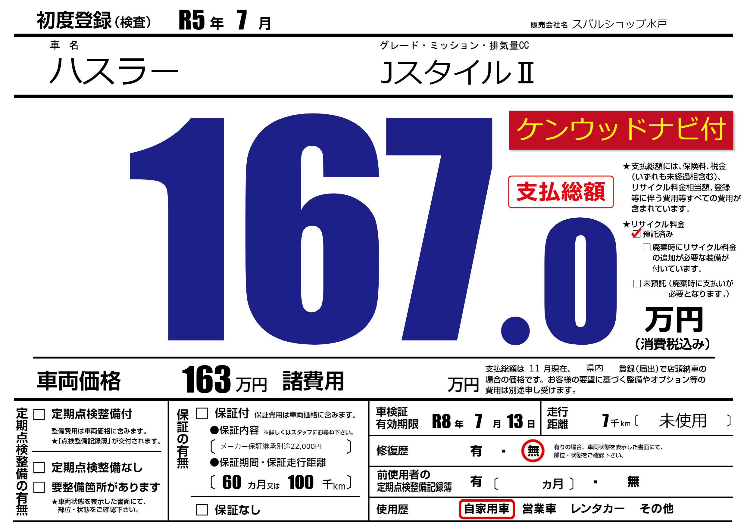 | 走行キロ | 0.7万km | 初年度登録 | R5年7月 |
