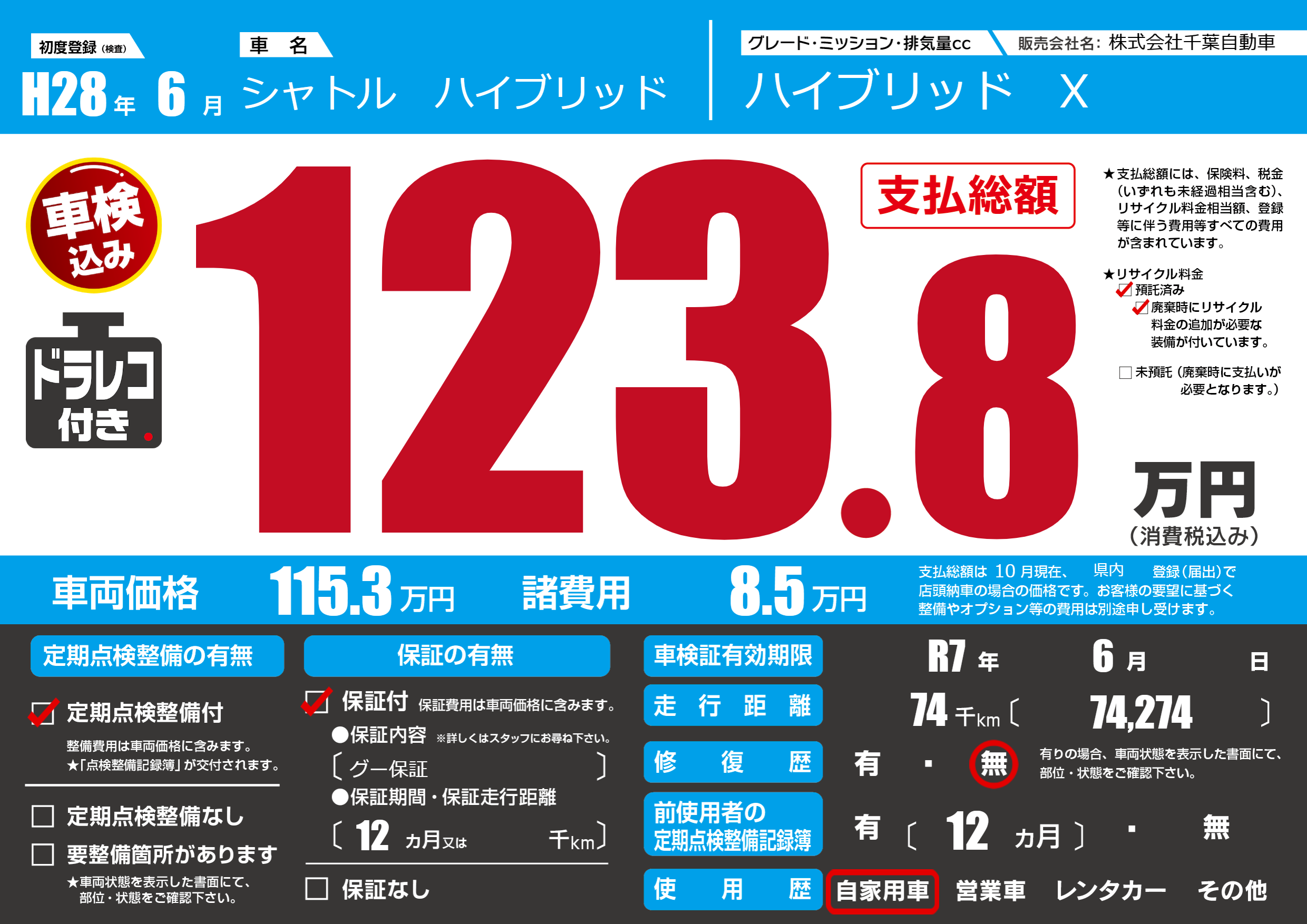 | 車検制限 | R7年 6月 - 日 | ||