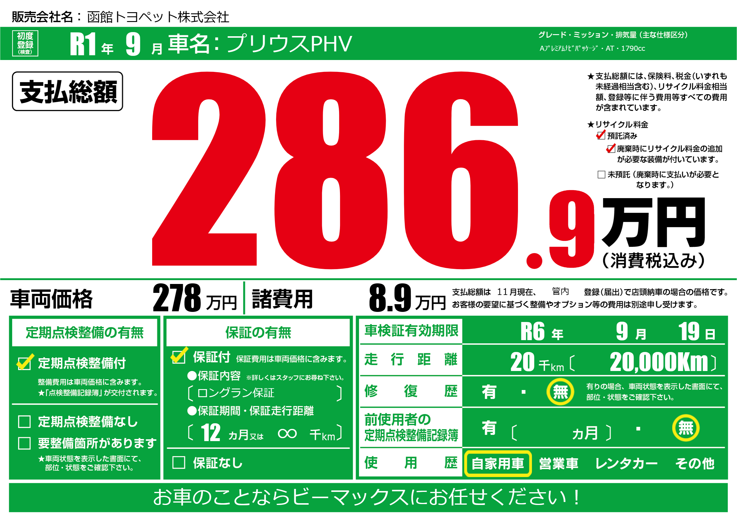 | 車名 | プリウスPHV | グレード ミッション 排気量 |