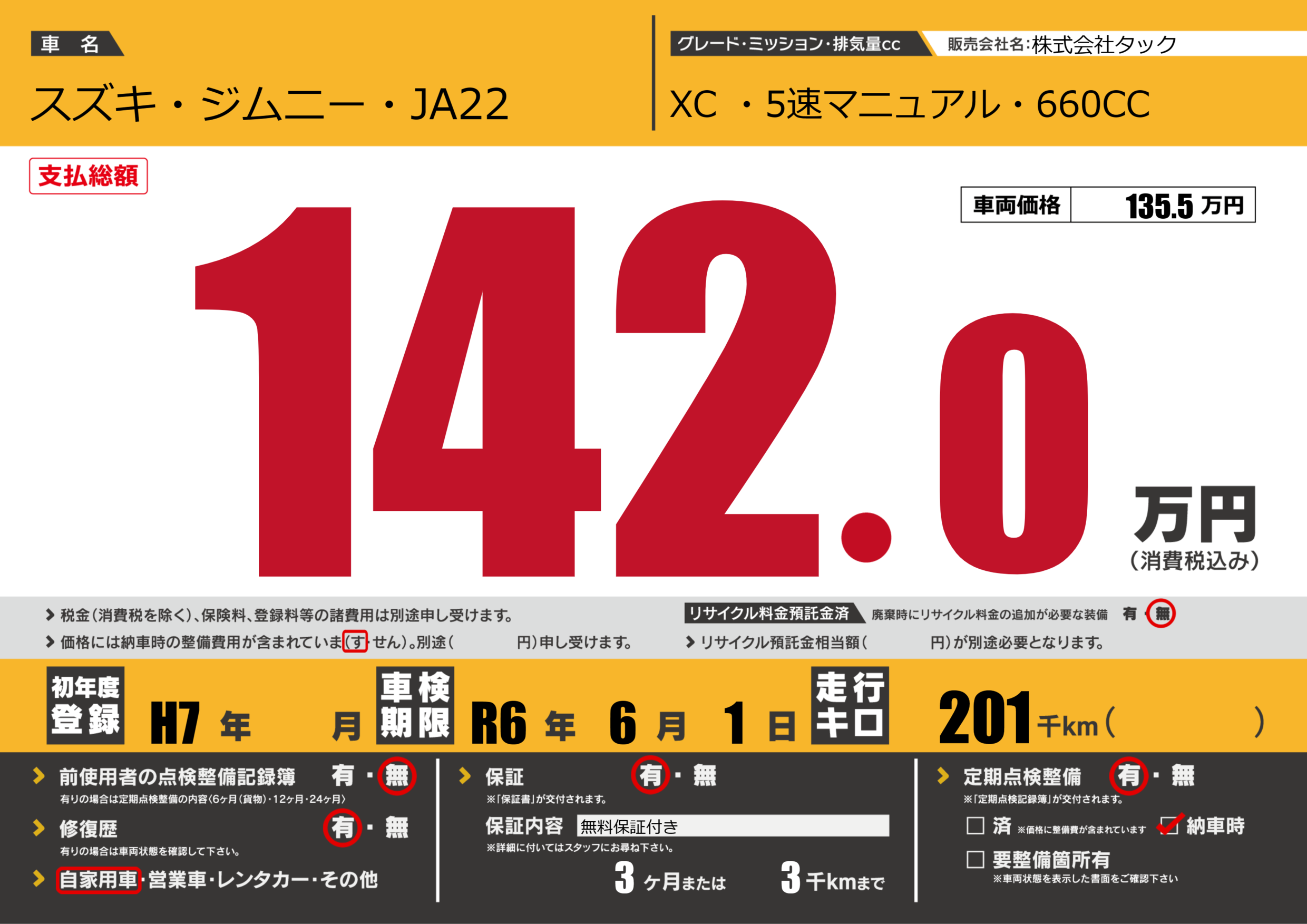 保証なし 保証内容(無料保証付き) 3ヶ月または(3)千kmまで |