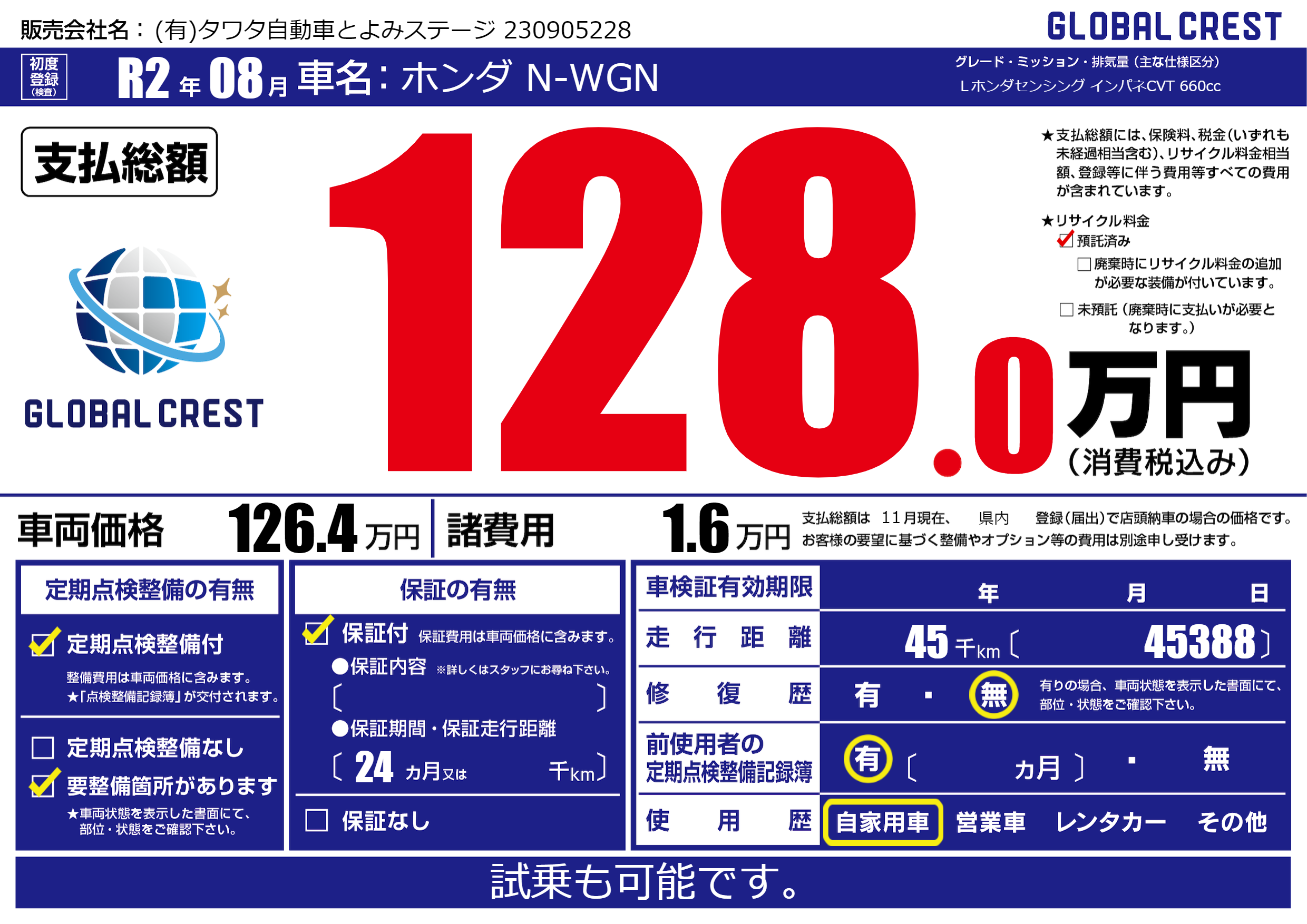 | 走行キロ | 4.5万km | 初年度登録 | R2年08月 |