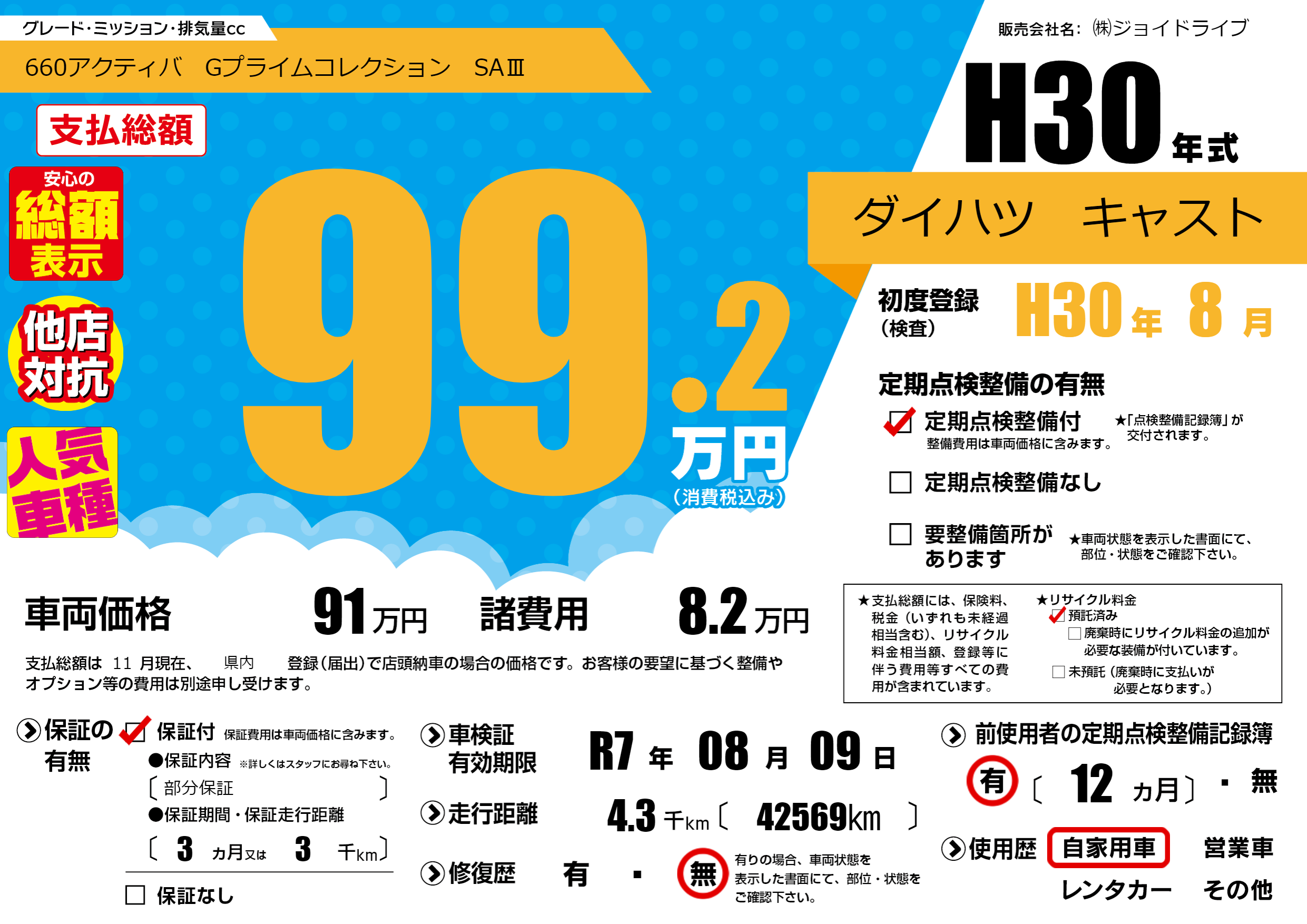 | 車名 | ダイハツ キャスト | グレード ミッション 排気量 |