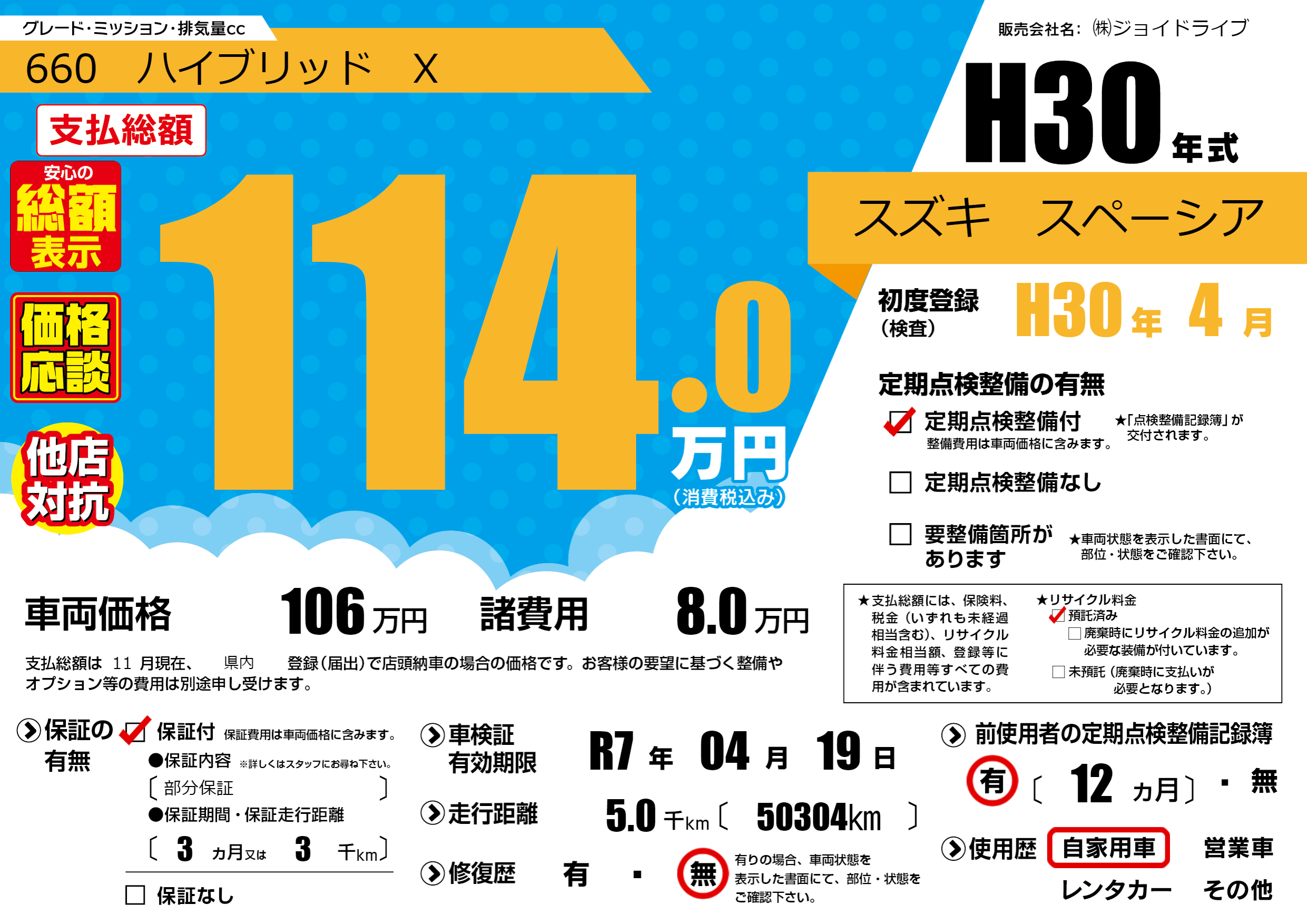 | 走行キロ | 0.5万km | 初年度登録 | H30年4月 |
