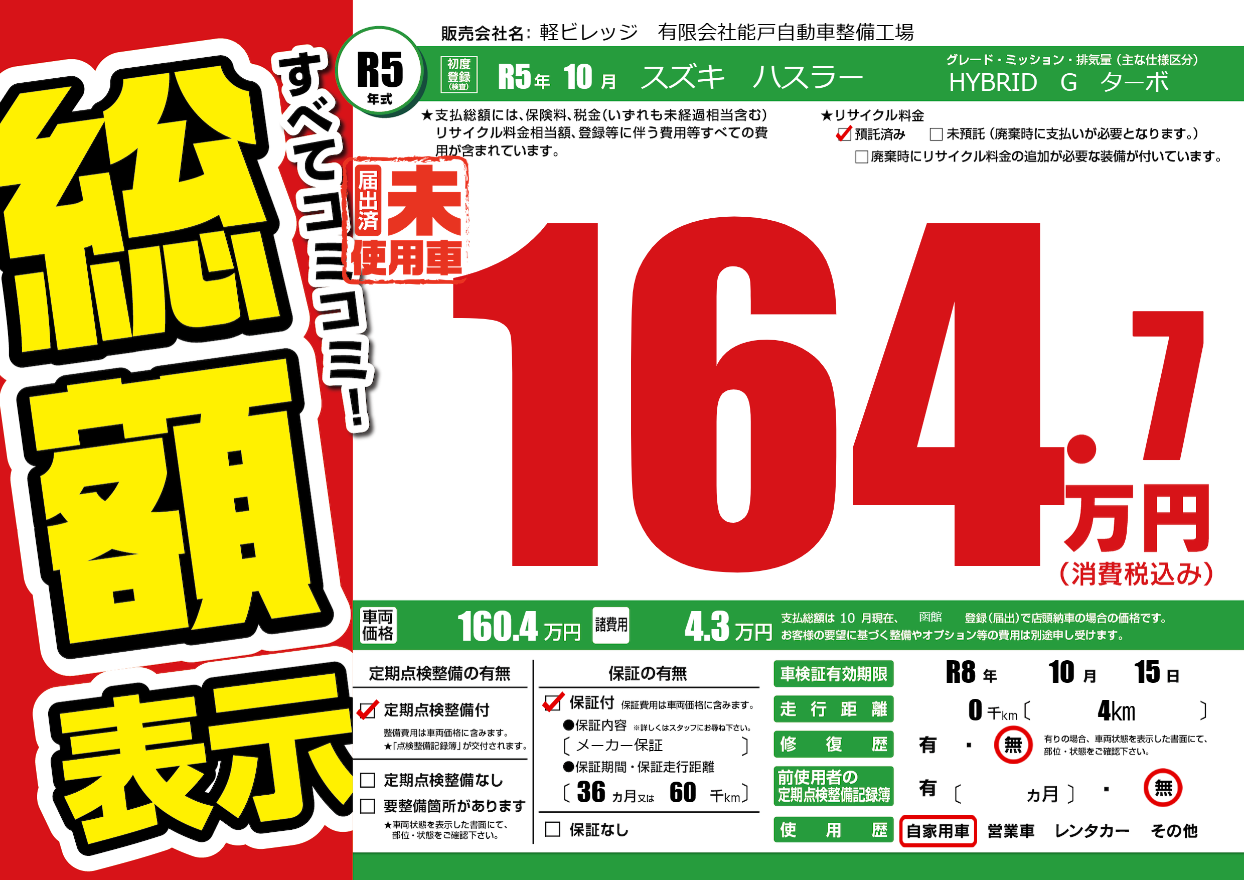 | 車名 | スズキ ハスラー | グレード ミッション 排気量 |