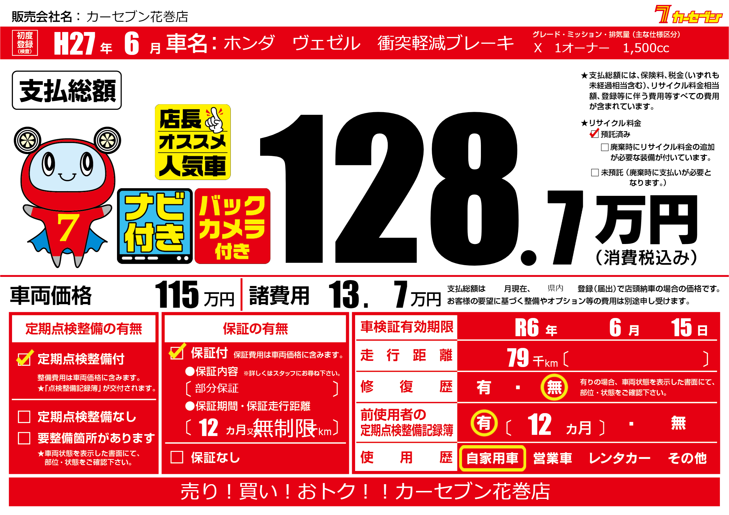 | 走行キロ | 7.9万km | 初年度登録 | H27年6月 |