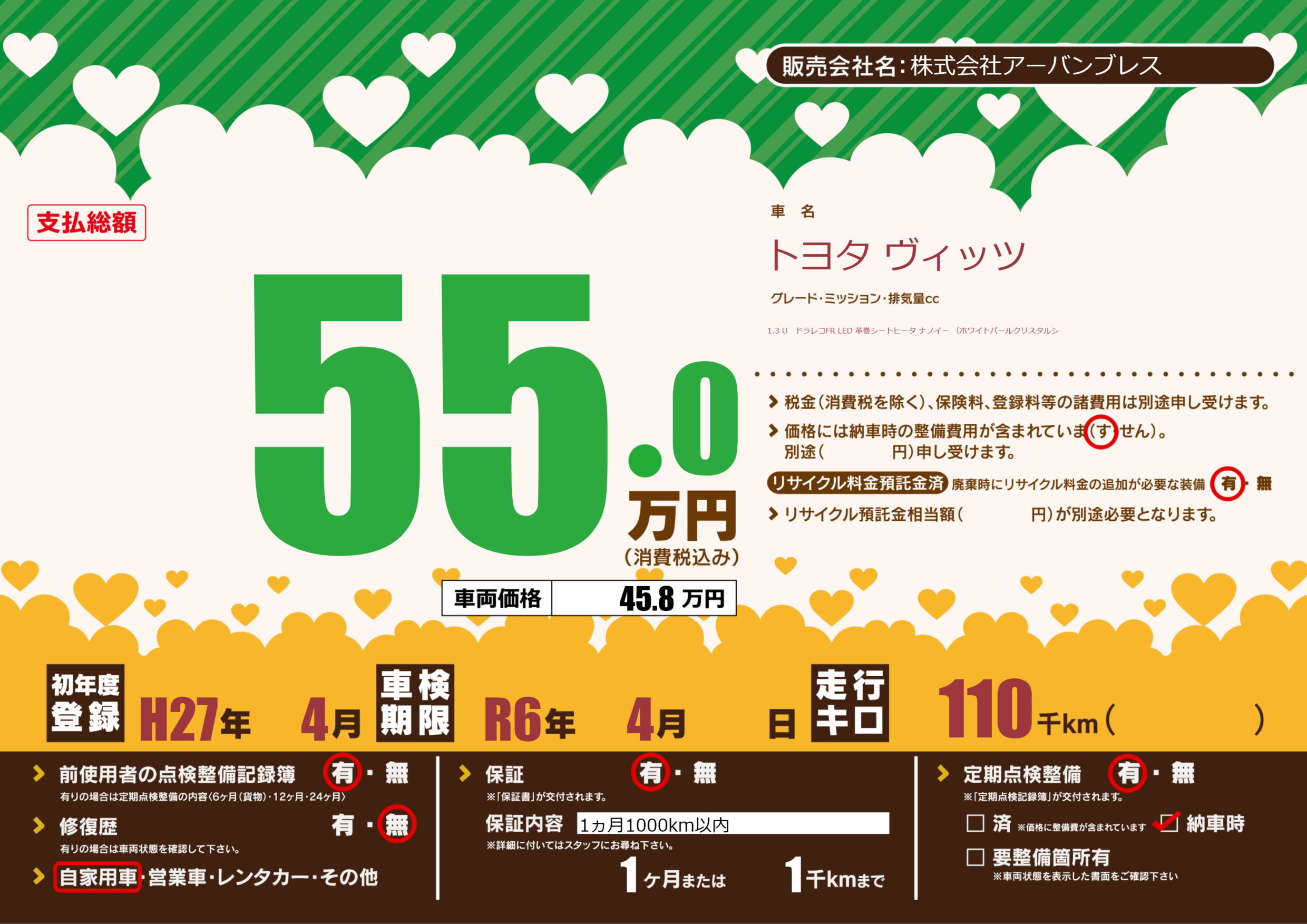 | 車名 | トヨタ ヴィッツ | グレード ミッション 排気量 |