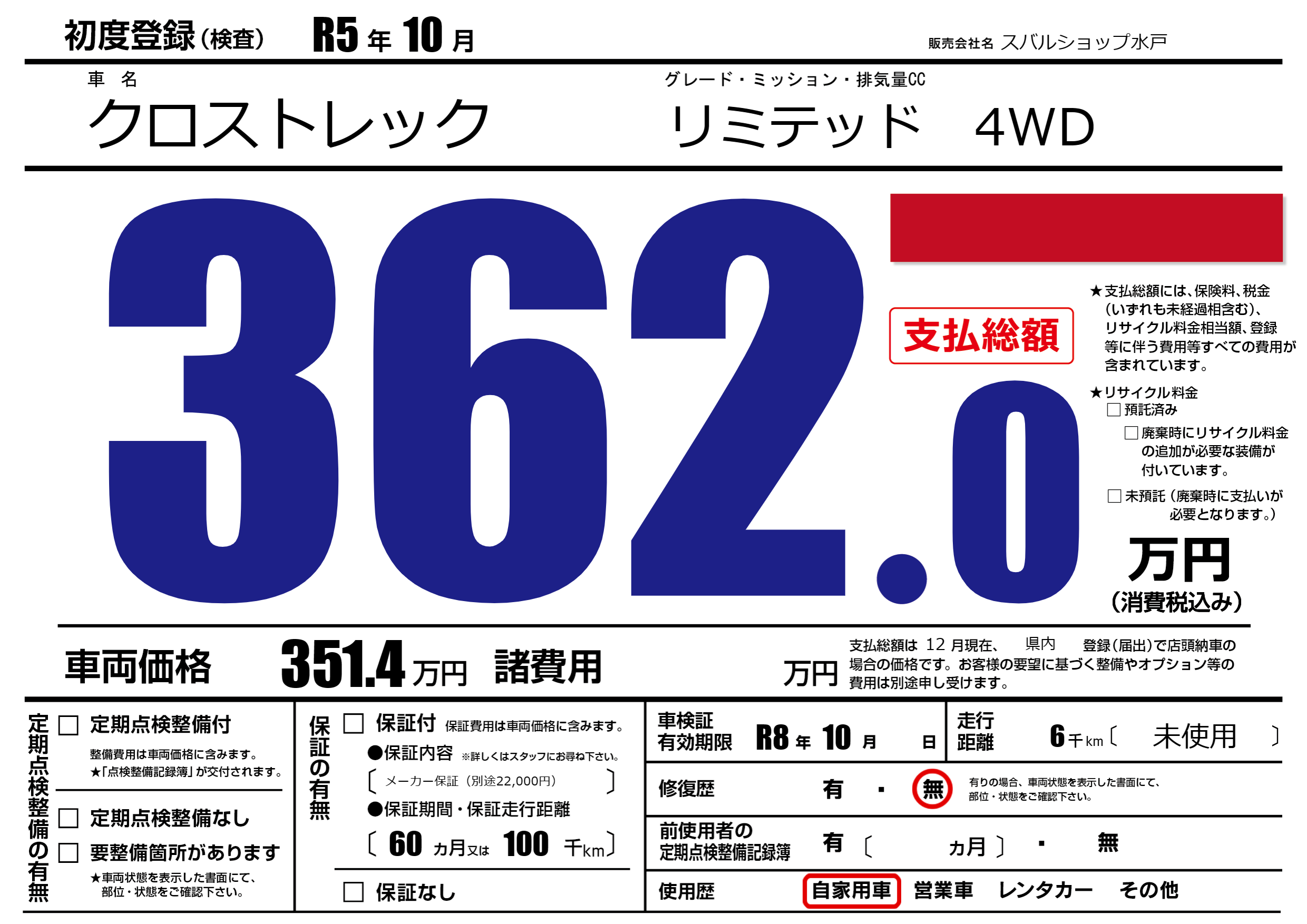 保証内容(メーカー保証(別途22,000円)) 60ヶ月または100千km