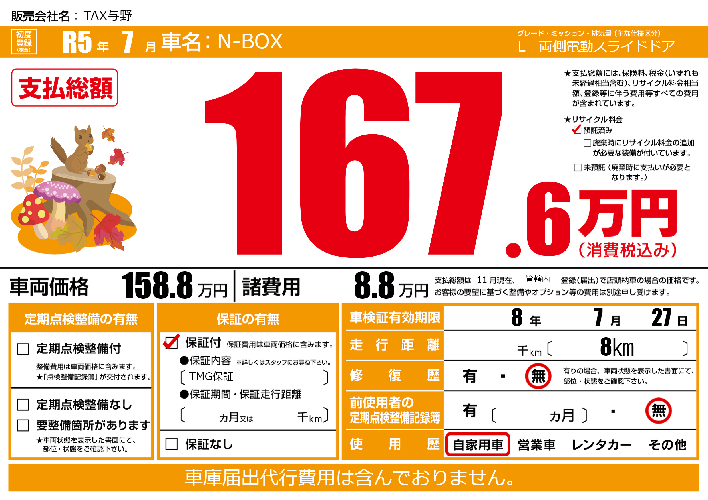保証付き 保証内容(TMG保証) ---ヶ月または()千kmまで |