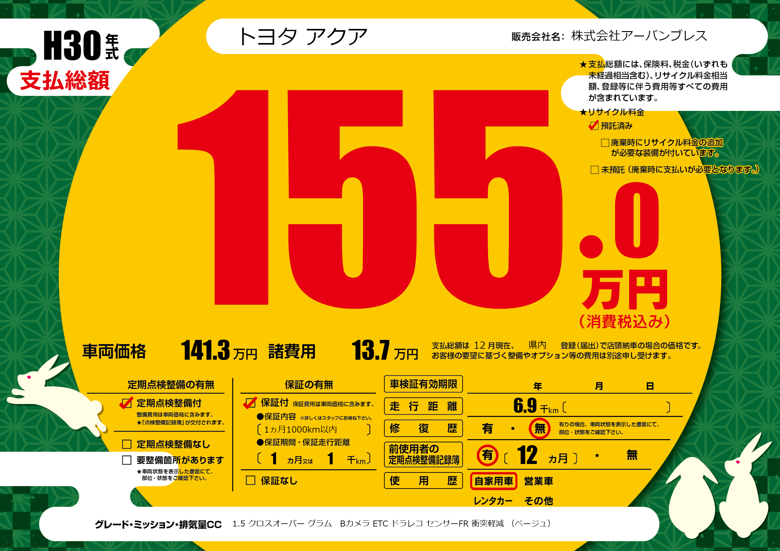 | 車名 | トヨタ アクア | グレード ミッション 排気量 |