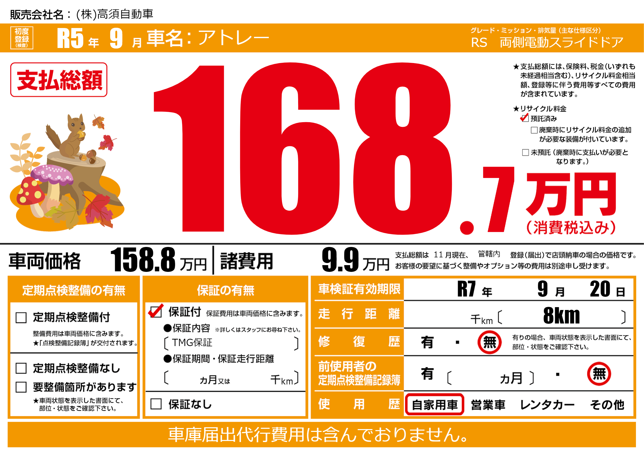 | 走行キロ | - | 初年度登録 | R5年9月 |
