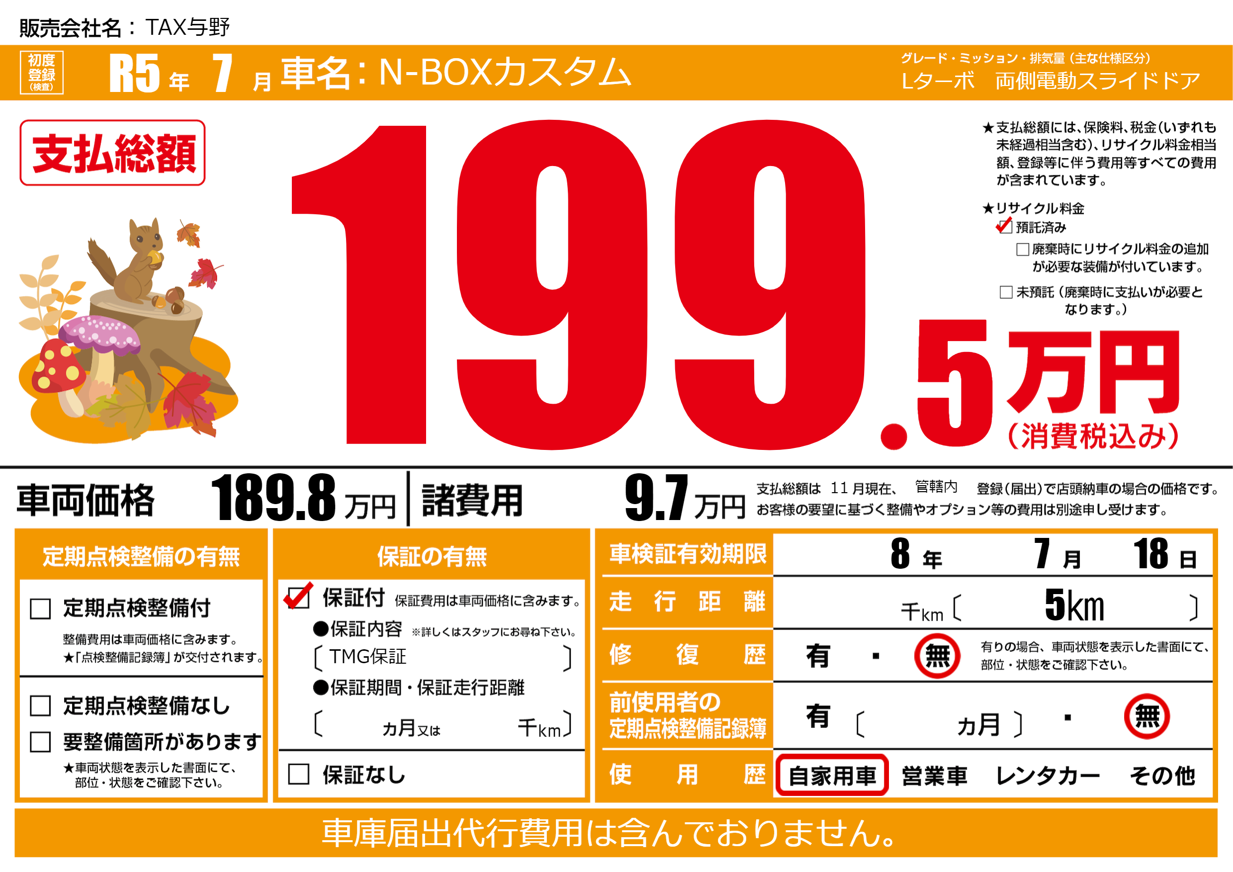 | 車名 | N-BOXカスタム | グレード ミッション 排気量 |