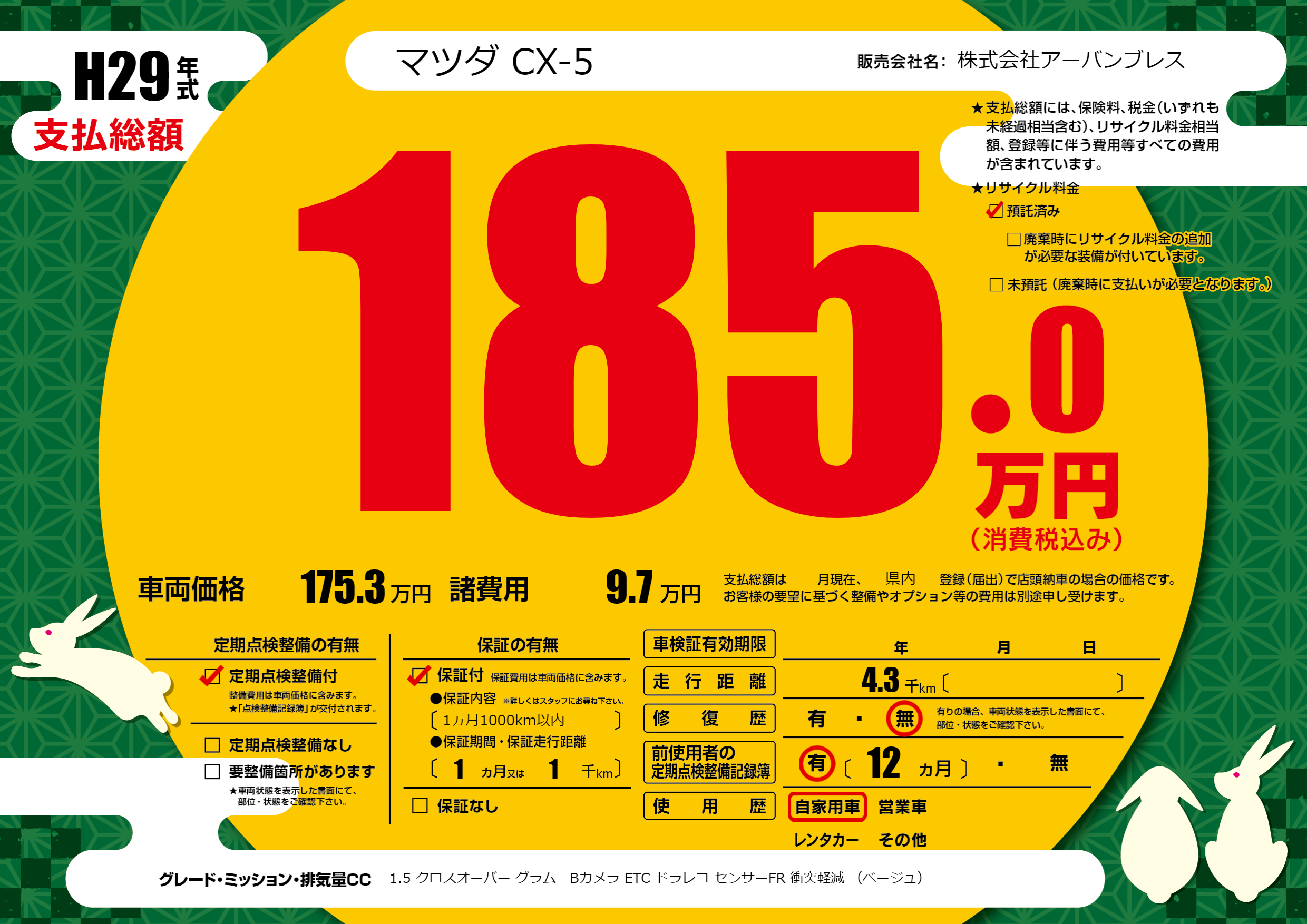 | 車名 | マツダ CX-5 | グレード ミッション 排気量 |