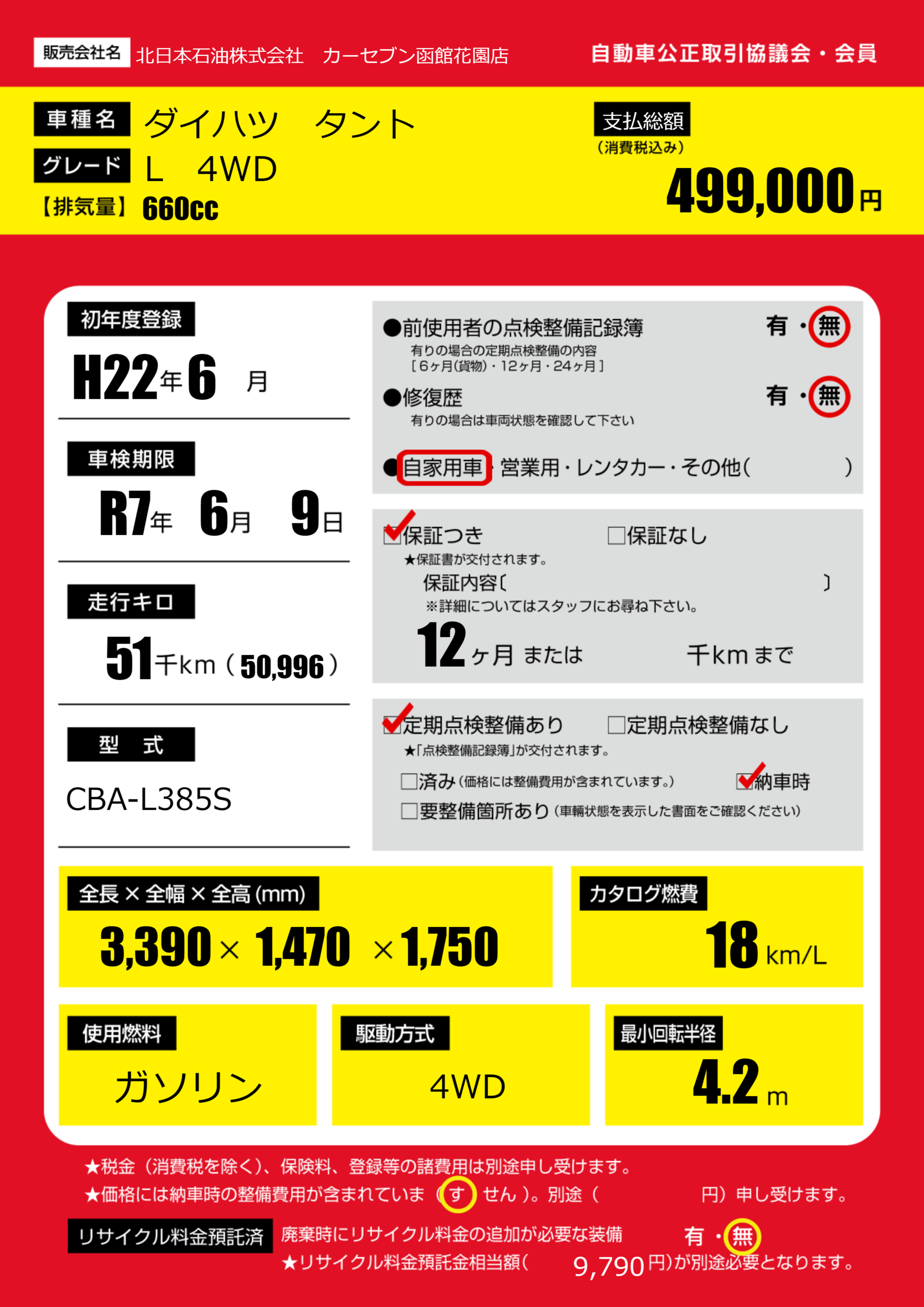 | 車名 | ダイハツ タント | グレード ミッション 排気量 |
