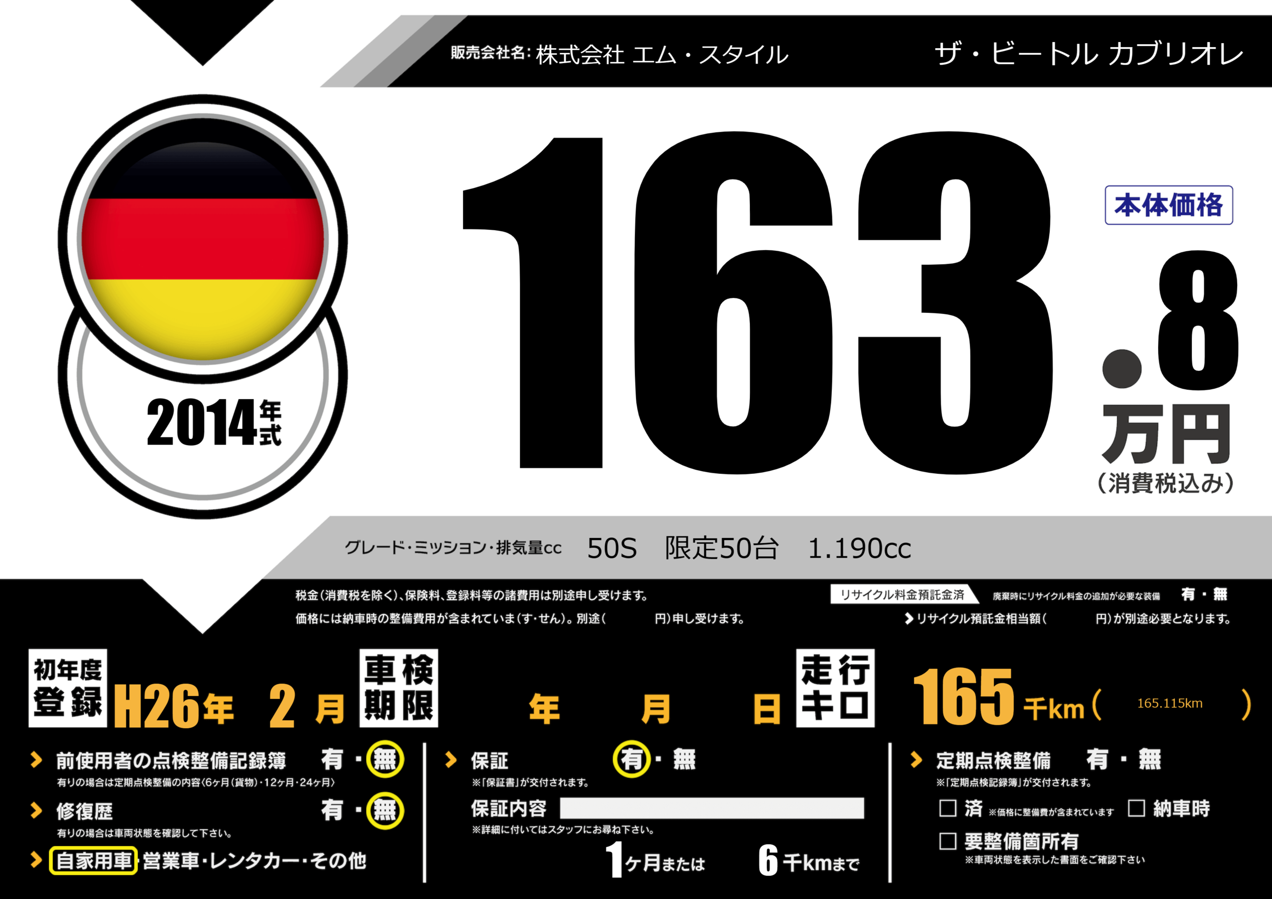| 車名 | ザ・ビートル カブリオレ | グレード ミッション 排気量 |