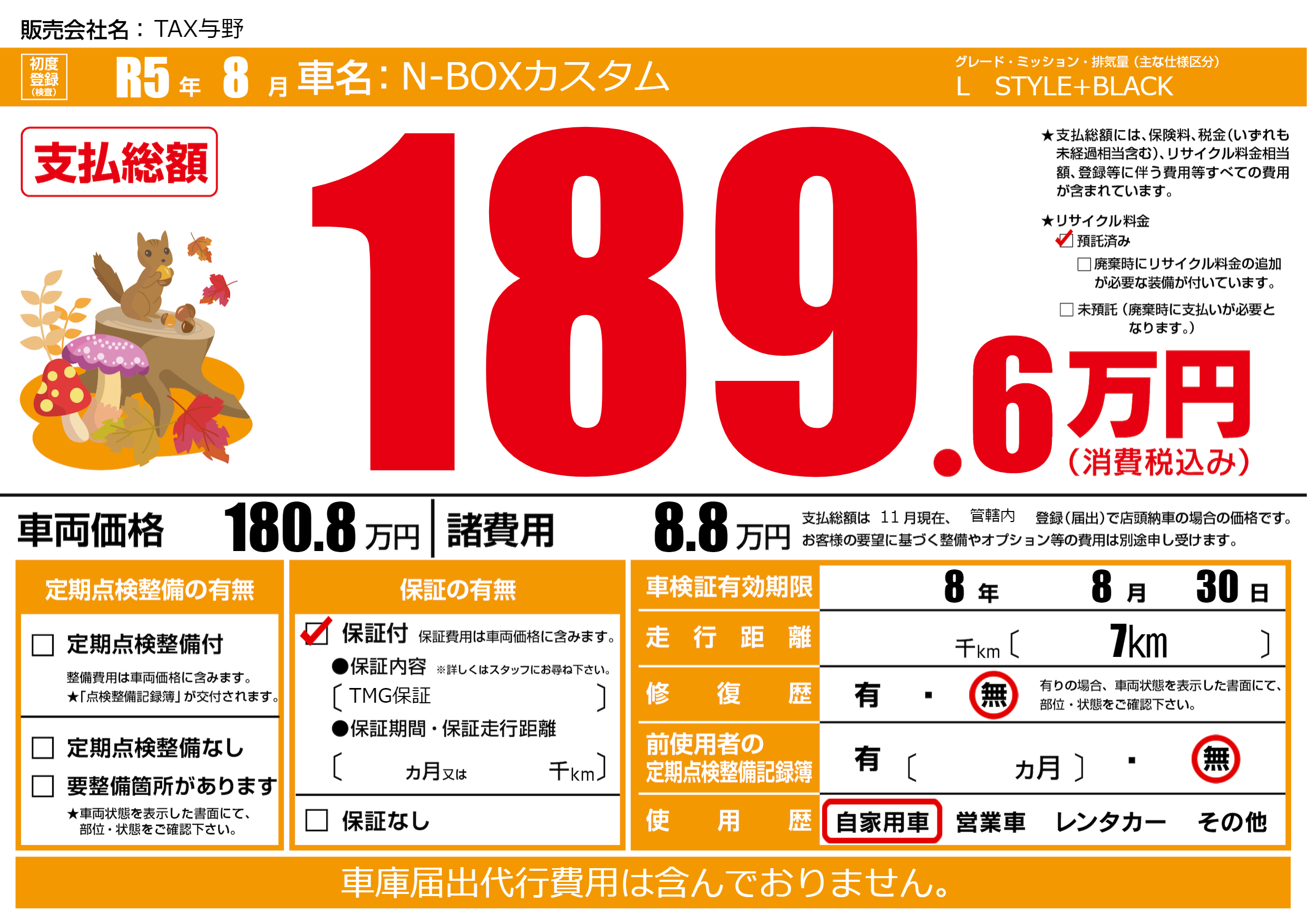 | 走行キロ | - | 初年度登録 | R5年8月 |
