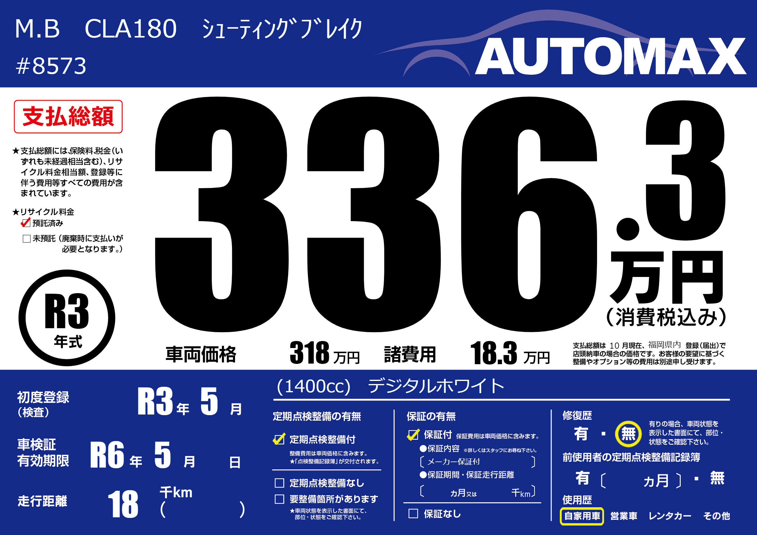 | 車名 | M.B CLA180 シューティングブレイク | グレード ミッション 排気量 |