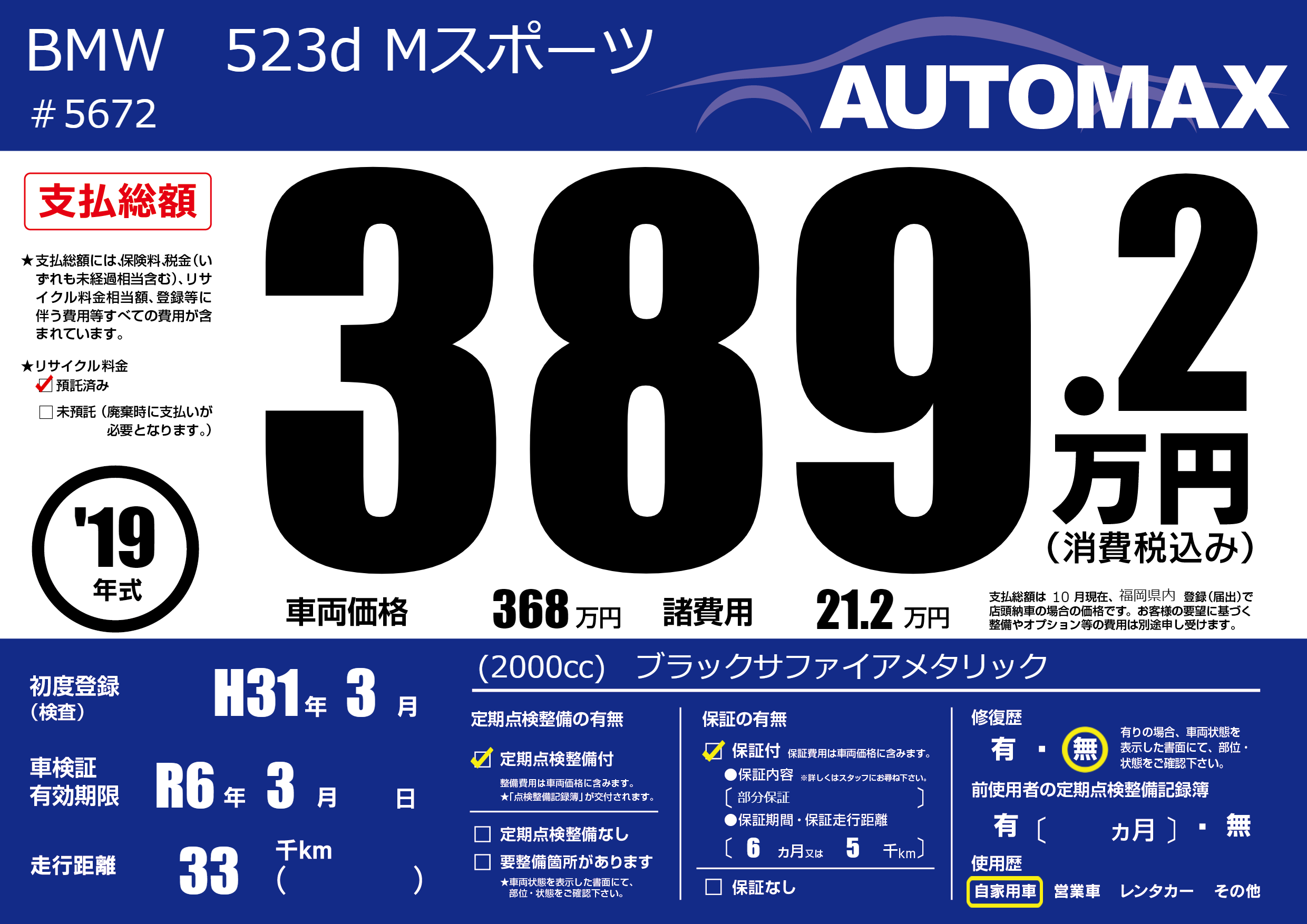 | 車名 | BMW 523d Mスポーツ | グレード ミッション 排気量 |