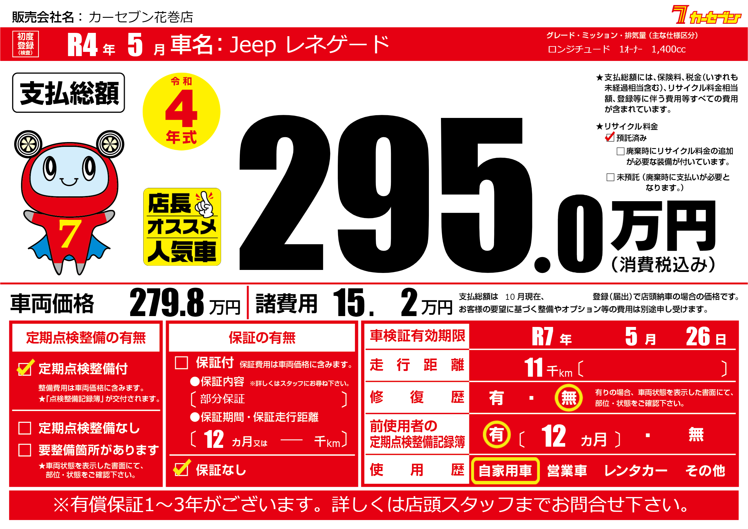 | 走行キロ | 1.1万km | 初年度登録 | R4年5月 |